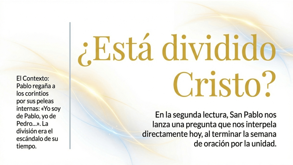 Sin embargo, san Pablo también nos dirige hoy un reproche necesario en la segunda lectura al hablar de las discordias en la comunidad de Corinto. Nos pregunta con seriedad: “¿Está dividido Cristo?”. En este día en que concluimos la semana por la unidad, la Palabra nos urge a estar unidos en un mismo pensar y sentir, recordándonos que el bautismo nos une a Cristo, el único Salvador, y no a grupos o facciones humanas. Las divisiones son un atentado contra Cristo mismo, pues Él quiere que vivamos como hermanos en la fe, abrazados todos a la vez por su amor.