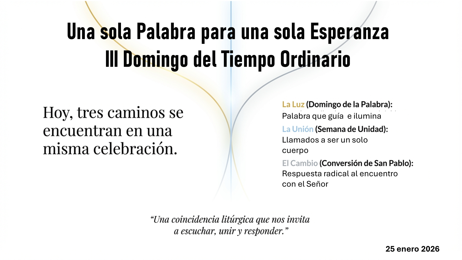 Este tercer domingo del tiempo ordinario, la Iglesia, celebra de manera especial como el Domingo de la Palabra de Dios, tiempo dedicado a la celebración, reflexión y difusión de la Palabra que es “lámpara para nuestros pasos y luz en nuestro sendero”. Este año, nuestra celebración dominical se ve enriquecida y providencialmente unida a la fiesta de la Conversión del apóstol san Pablo, jornada que concluye además la Semana de Oración por la Unidad de los Cristianos “Una solo Espíritu una sola Esperanza” Es un día para dejar que “la Palabra de Cristo habite entre nosotros” en toda su riqueza, para que tome residencia estable en nuestro corazón y transforme nuestra existencia.