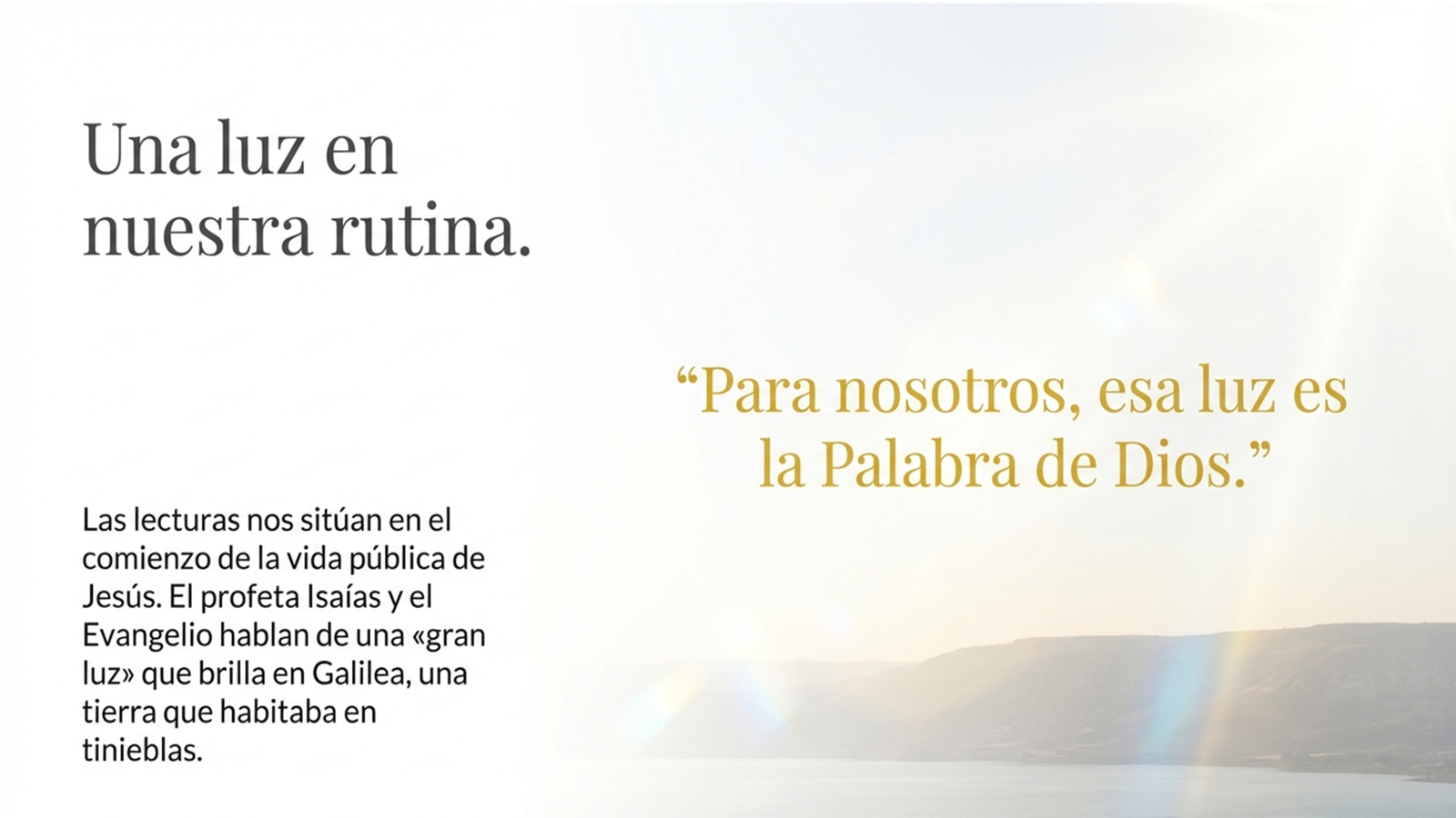 En la primera lectura, el profeta Isaías nos hablaba de una realidad que hoy vemos cumplida en el Evangelio: un pueblo que caminaba en tinieblas ha visto una gran luz. Esa luz no es otra que la presencia de Jesús, quien comienza su predicación precisamente en la “Galilea de los gentiles”, un lugar periférico, fronterizo y casi olvidado, demostrando que la salvación de Dios no tiene fronteras y alcanza incluso aquellas tierras que no eran consideradas dignas por las personas religiosas de su tiempo. Jesús se establece allí para anunciar que el Reino de los cielos está cerca y hace una llamada urgente a la conversión, a un cambio de mentalidad, a una reorientación completa de nuestra vida hacia Dios.