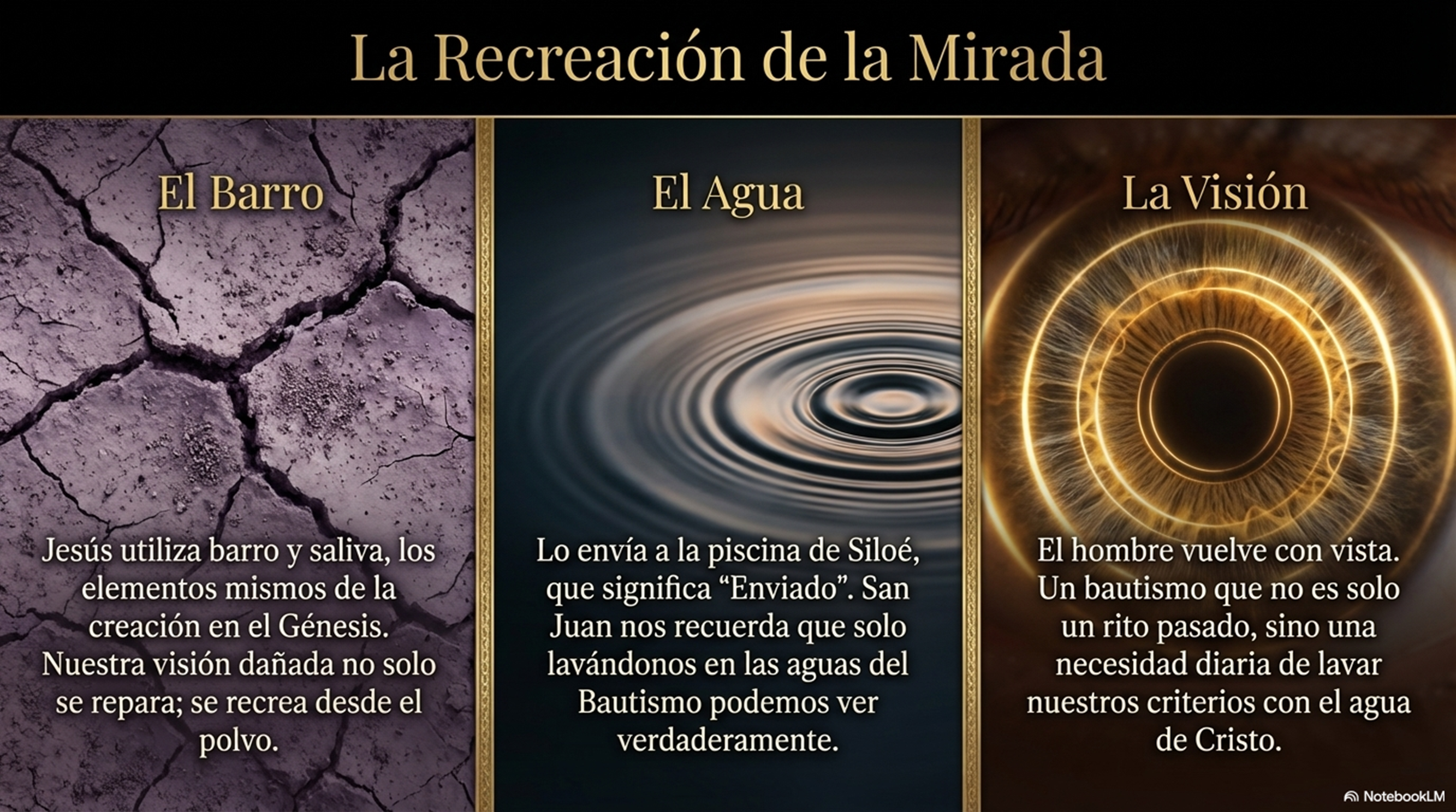 Jesús utiliza el barro y la saliva, elementos de la creación, para recordarnos que nuestra visión dañada necesita ser recreada. Al enviarlo a la piscina de Siloé, que significa “Enviado”, san Juan nos está diciendo que, solo lavándonos en las aguas del Bautismo, que es Cristo mismo, podemos empezar a ver la realidad como Dios la ve.