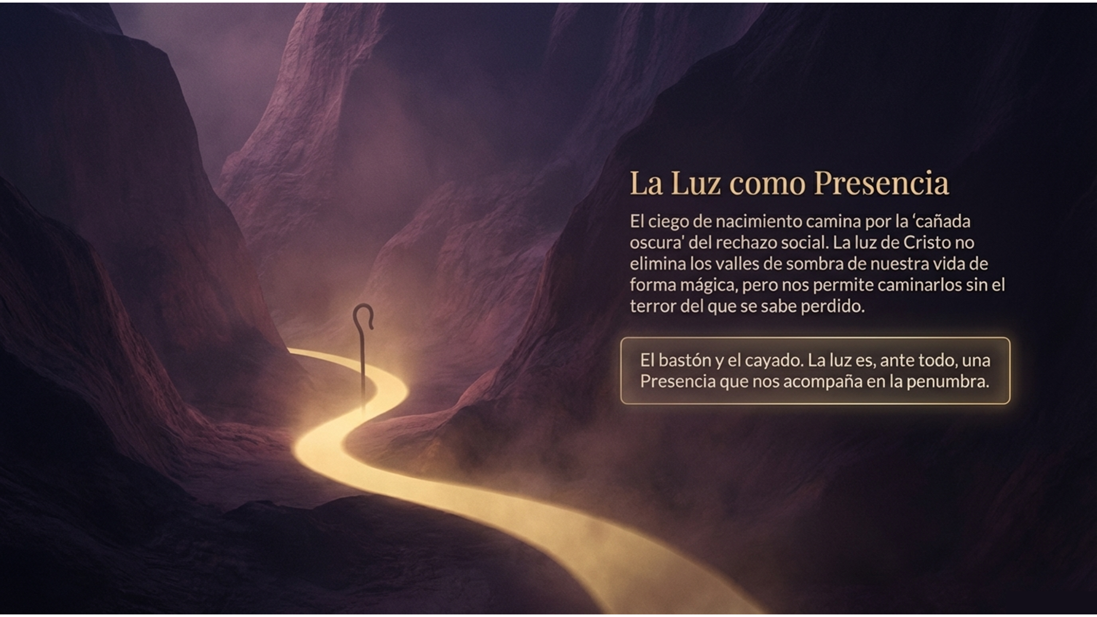 Este tránsito del ciego se refleja bellamente en el Salmo, el del Buen Pastor, “Aunque camine por cañadas oscuras, nada temo, porque tú vas conmigo”. El ciego de nacimiento camina por la cañada oscura del rechazo social y la ceguera física, pero al encontrarse con la Luz del Mundo, su bastón y su cayado le dan sosiego. La luz de Cristo no elimina los valles de sombra de nuestra vida, pero nos permite caminarlos sin el terror del que se sabe perdido. La luz es, ante todo, una Presencia que nos acompaña.