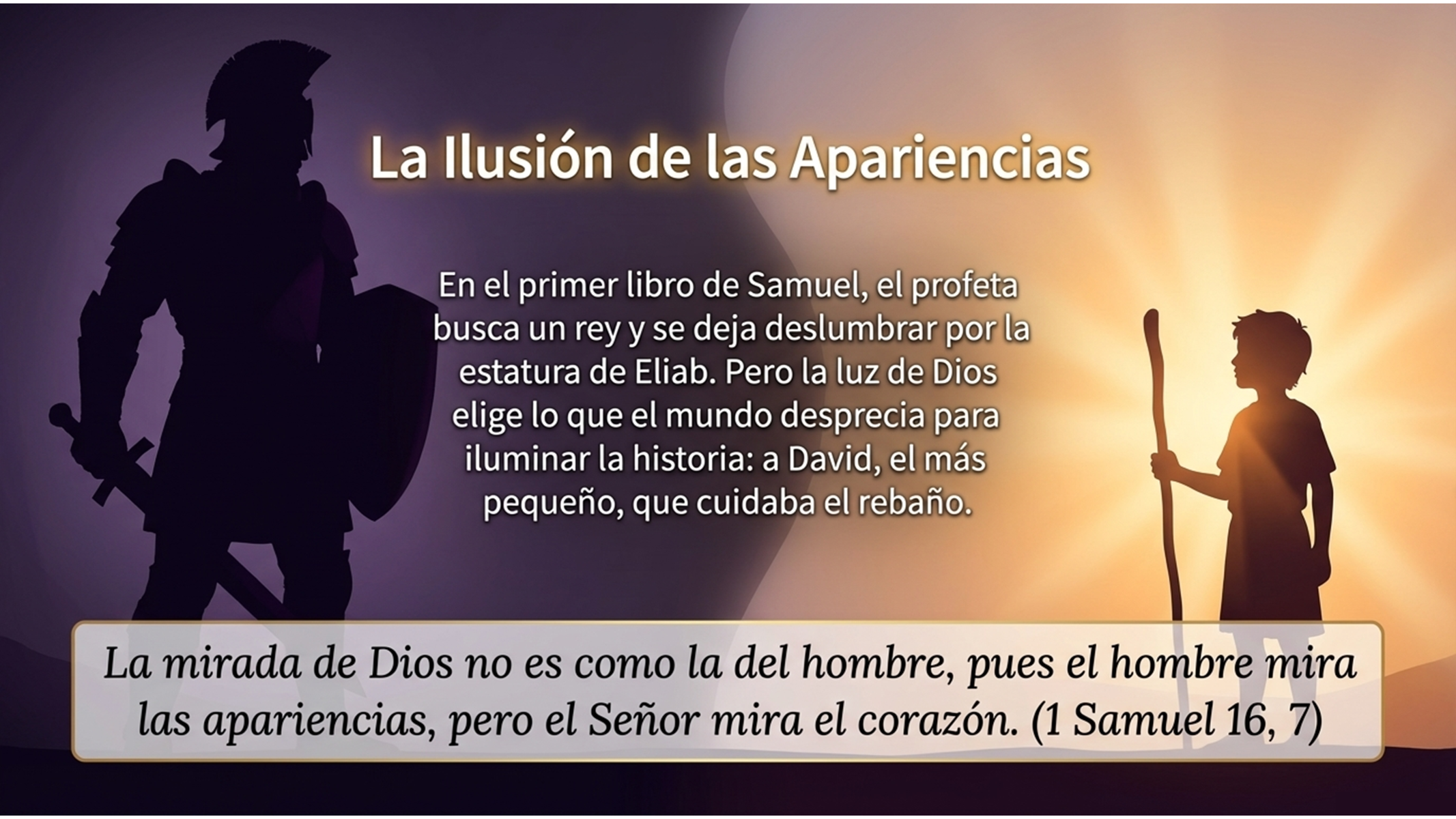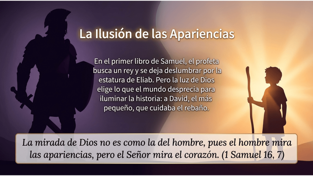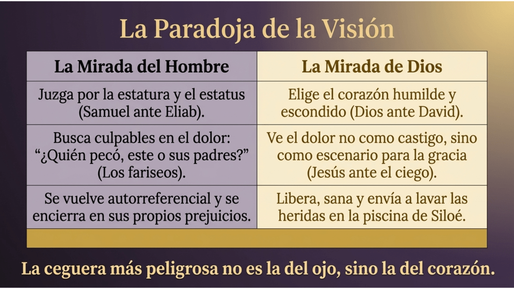 La primera lectura del primer libro de Samuel nos ofrece la clave teológica para entender por qué a veces, teniendo ojos, estamos ciegos. Samuel va a buscar un rey entre los hijos de Jesé y se deja deslumbrar por la apariencia de Eliab. Sin embargo, Dios pronuncia una frase que debe ser el ancla de nuestra meditación: “La mirada de Dios no es como la del hombre, pues el hombre mira las apariencias, pero el Señor mira el corazón”.