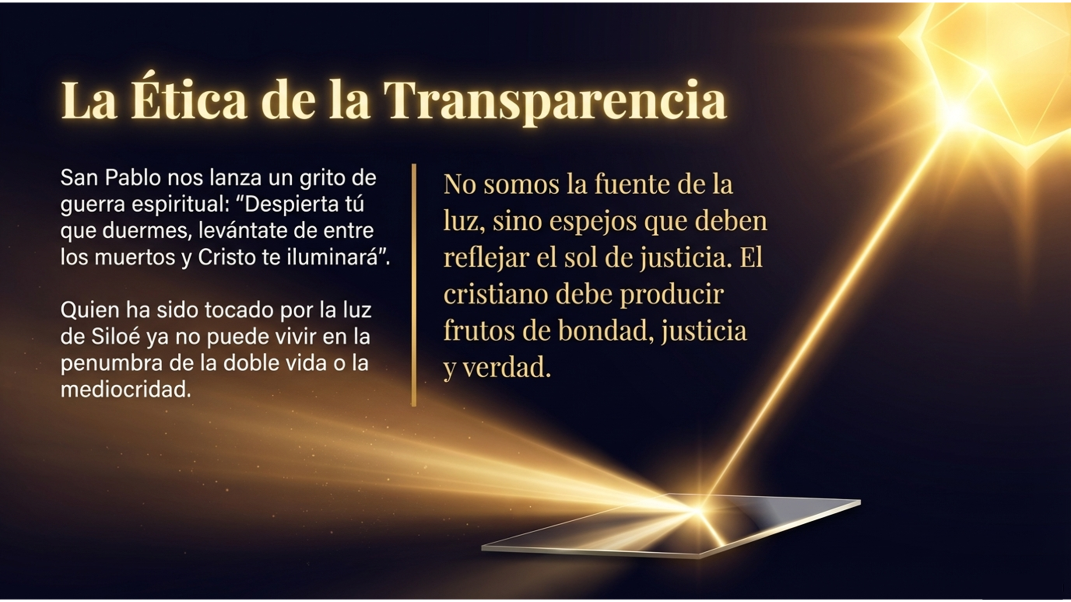 Esto implica una ética de la transparencia. El cristiano no puede vivir en la penumbra de la doble vida o de la mediocridad. Quien ha sido tocado por la luz de Siloé debe producir frutos de bondad, justicia y verdad. No somos la fuente de la luz, sino espejos que deben reflejar el sol de justicia que es Cristo.
