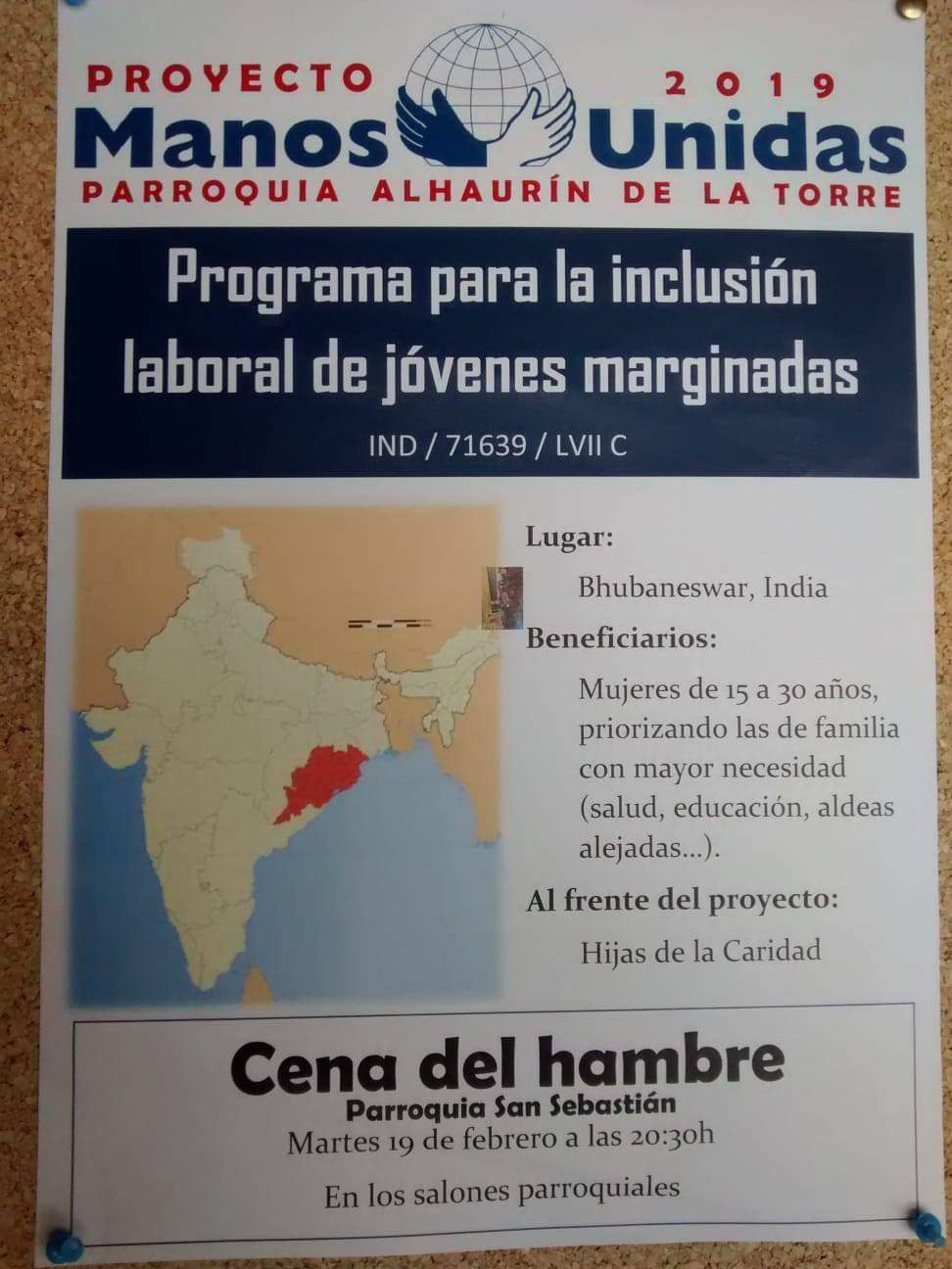 Después celebraremos, la «Cena del Hambre». El proyecto en el que colaboramos para este año, es para «La inclusión laboral de jóvenes marginadas» en Bhubaneswar (India). Al frente de este proyecto está las Hijas de la Caridad y está especialmente dirigido a mujeres entre 15 y 30 años priorizando las familias de mayor necesidad. Os dejamos cartel: