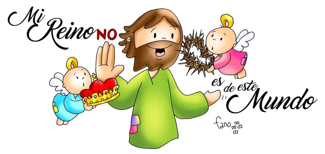 En el evangelio Jesús es Rey, pero Jesús dice “Mi reino no es de este mundo”. No está basado en el poder político, en el económico o en la fuerza de las armas. Antes las preguntas de Pilato, el la última responde “Tú lo dices: soy rey. Yo para esto he nacido y para esto he venido al mundo: para dar testimonio de la verdad. Todo el que es de la verdad escucha mi voz”