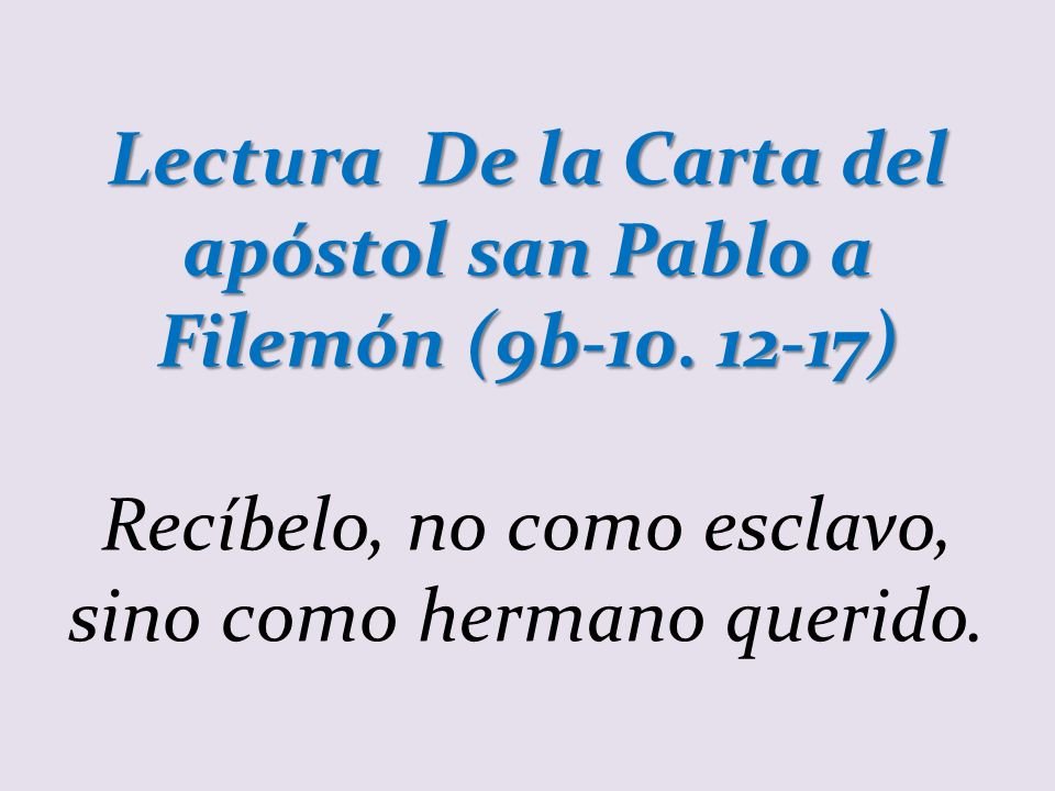 En segunda lectura, de la carta de Pablo a Filemón, trata de un esclavo que se le ha escapado a Filemón. La esclavitud era normal en tiempos de Jesús y Pablo. Pero en este caso, Pablo, da a Filemón las consignas básicas para remediar la situación dentro de lo posible y llegar en el futuro a la abolición de toda esclavitud. Al esclavo Onésimo, que había huido, con el consiguiente disgusto de Filemón, lo encontró Pablo en prisión y le convirtió a la fe.