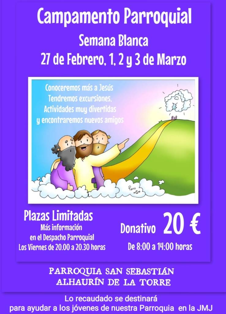 Liturgia Campamento Parroquial Semana Blanca 18 febrero, 2023 Parroquiaalhaurindelatorre Deja un comentario Los días y horas para inscribirse son: Sábados de 5 a 6 de la tarde. Lunes de 5,30 a 7 de la tarde. Martes, miércoles y jueves de 7,15 a 8 de la tarde. Comparte esto: Haz clic para compartir en Facebook (Se abre en una ventana nueva) Facebook Me gusta Cargando... Relacionado