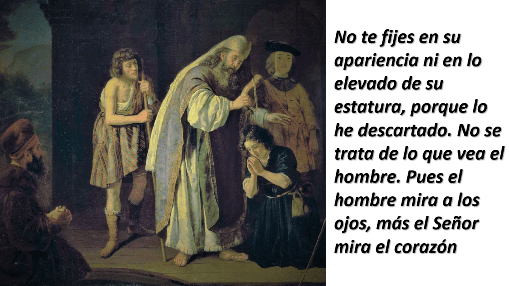 En la primera lectura, del primer libro de Samuel, nos encontramos con la figura del rey David, uno de los personajes más importantes de la historia del pueblo de Israel, junto a Abraham y Moisés. David a pesar de sus pecados fue un rey según el corazón de Dios. En la lectura de hoy, el profeta Samuel, recibe el encargo de buscar sucesor al rey Saúl, a pesar de que este aún vivía. De los hijos de Jesé, los mayores parecían favoritos para ocupar el cargo de rey, pero dios tiene una manera de pensar distinta, no juzga por las apariencias, la esbeltez y la fuerza en este caso pasa a un segundo plano, sino que Dios ve el corazón de la persona, y elige precisamente al hermano menor, al más joven, a David, se fija en lo pequeño, lo despreciable, lo débil para llevar a cabo su obra de salvación. Samuel, lo mismo que antes había ungido al rey Saúl, ahora unge a David. La unción tiene el significado de la fuerza y salud que Dios otorga al elegido para la misión encomendada, una vez ungido “invadió a David el Espíritu del Señor”. El salmo nos recuerda que el verdadero pastor, el autentico es Dios mismo “El Señor es mi pastor, nada me falta, … nada temo porque tú vas conmigo”
