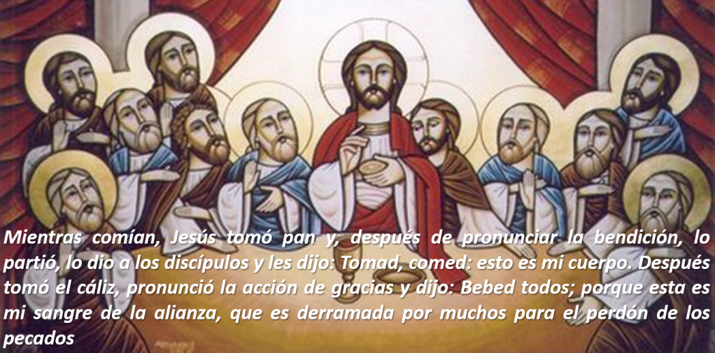La celebración de la Pascua, el anuncio de la traición de Judas “Al atardecer se puso a la mesa con los Doce. Mientras comían dijo: En verdad os digo que uno de vosotros me va a entregar” y la institución de la Eucaristía “Mientras comían, Jesús tomó pan y, después de pronunciar la bendición, lo partió, lo dio a los discípulos y les dijo: Tomad, comed: esto es mi cuerpo. Después tomó el cáliz, pronunció la acción de gracias y dijo: Bebed todos; porque esta es mi sangre de la alianza, que es derramada por muchos para el perdón de los pecados”, es el segundo momento y que tiene lugar en el cenáculo “mi hora está cerca; voy a celebrar la Pascua en tu casa con mis discípulos”