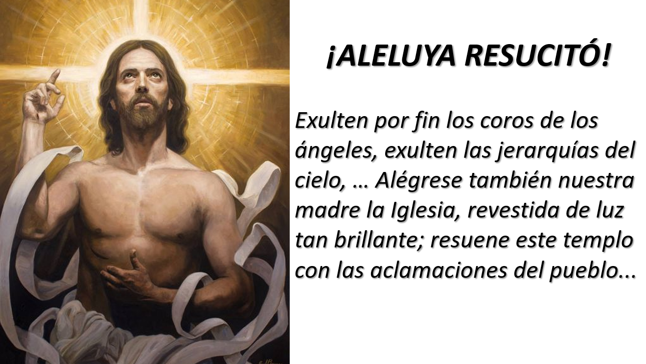 “Exulten por fin los coros de los ángeles, exulten las jerarquías del cielo, … Alégrese también nuestra madre la Iglesia, revestida de luz tan brillante; resuene este templo con las aclamaciones del pueblo…” estas palabras expectantes dan paso a la alegría exultante de la Pascua, y con ellas iniciamos los cincuenta días pascuales. Forman parte del pregón pascual que anuncia la Resurrección de Jesús.