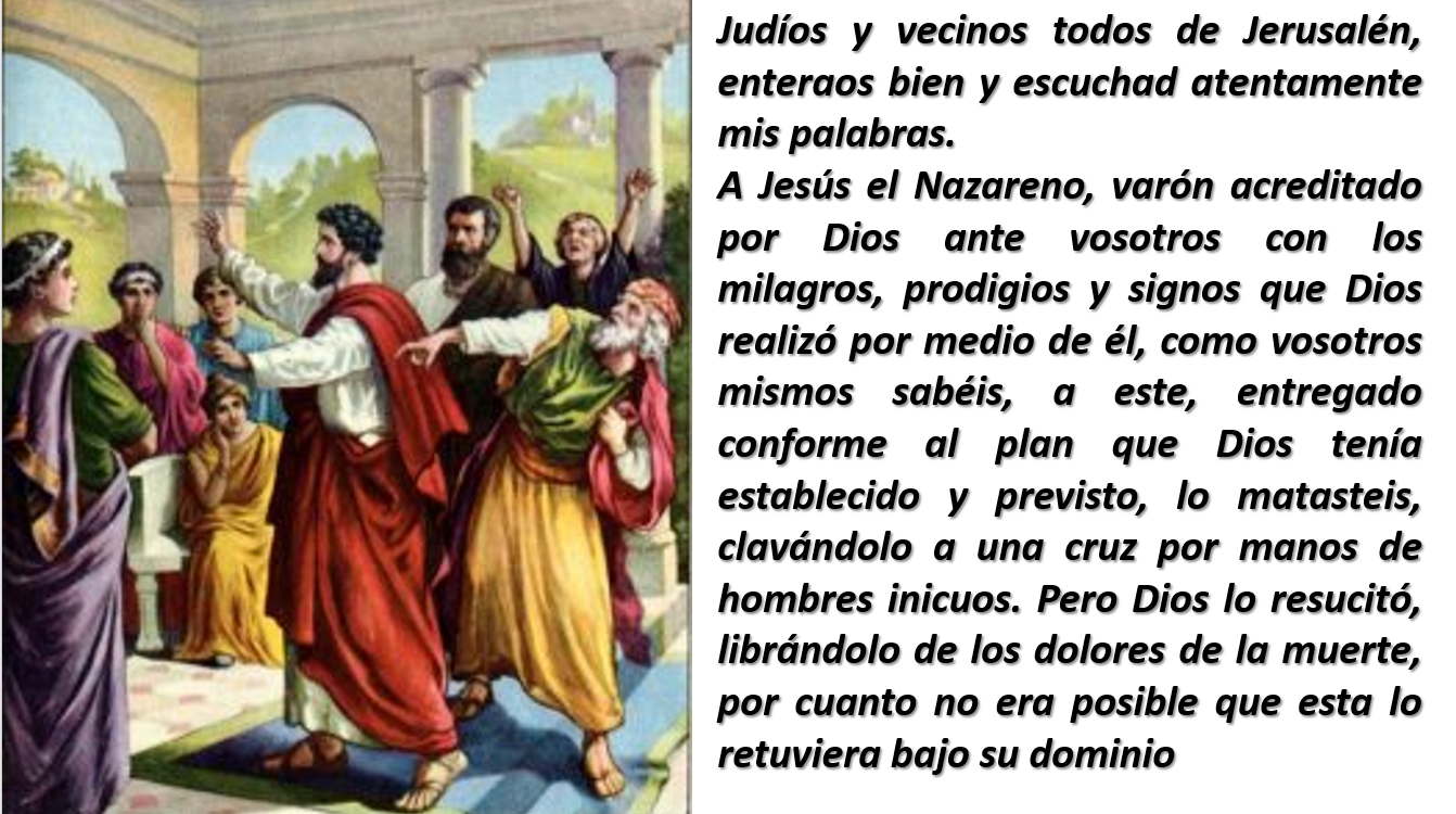 En la lectura del libro de los Hechos, encontramos parte del discurso de Pedro el día de Pentecostés. En el aparece formulado el kerigma de la Iglesia primitiva, es decir, los núcleos principales de la fe tal y como fue entendida y formulada desde los inicios de la Iglesia. El resultado positivo del discurso de Pedro, no depende de una argumentación de tipo rabínico, sino del Espíritu que ha dado fuerza al testimonio de Pedro frente al hecho inaudito del Crucificado resucitado. El acontecimiento Jesucristo, su vida, y sobre todo, su muerte en la cruz, es comprendido a la luz de las Escrituras de Israel. Dios no abandona a Jesús tras su muerte injusta en la cruz “Dios lo resucitó, librándolo de los dolores de la muerte, por cuanto no era posible que esta lo retuviera bajo su dominio”. Lo resucitó, lo exaltó y le dio el Espíritu, tras lo cual la derramada, a su vez sobre sus seguidores. El salmo nos hace aplicar sus afirmaciones a la resurrección de Jesús “se me alegra el corazón gozan mis entrañas y mi carne descansa esperanzada. Porque no me abandonarás en la región de los muertos ni dejarás a tu fiel conocer la corrupción”