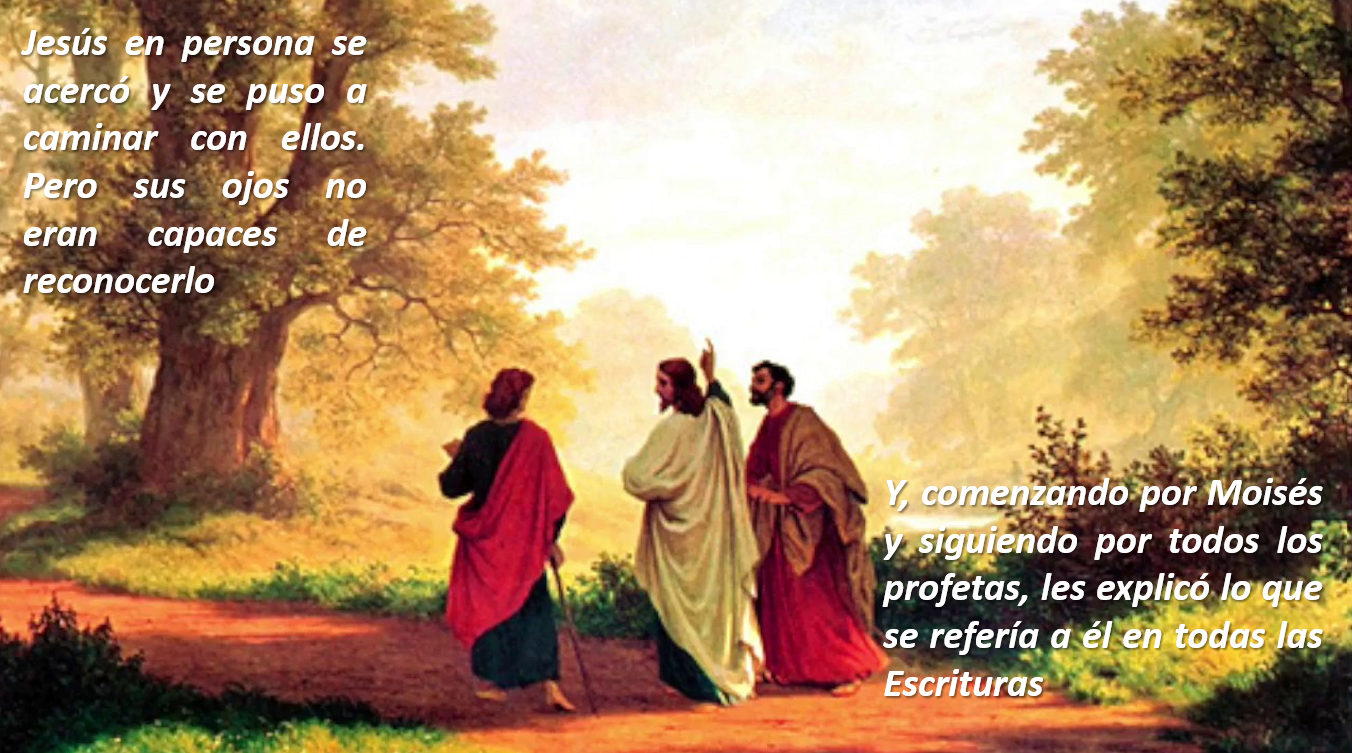 La lectura del evangelio de hoy, el camino hacia Emaús, viene a ser como una parábola de nuestra existencia, atravesada a menudo por la incomodidad, la decepción, el cansancio, el extravío, las ganas de plantarlo todo y volver atrás. Son esos momentos en los que nuestros ojos son incapaces de vislumbrar al Señor “Jesús en persona se acercó y se puso a caminar con ellos. Pero sus ojos no eran capaces de reconocerlo” Él está a nuestro lado caminado con nuestro paso cansado y apagado, está con nosotros como una presencia discreta, dispuesto a escucharnos sin hacernos reproches, ni juzgarnos o condenarnos.