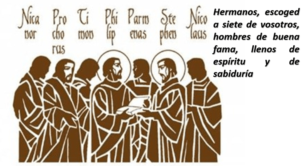 El libro de los Hechos de los Apóstoles, muestra como la comunidad, como cualquier colectivo humano, no esta exenta de conflictos y desavenencias. En la comunidad de Jerusalén se creó una fuerte tensión entre los de lengua hebrea y los de lengua griega, procedentes estos últimos de la diáspora romana y helenística, y que tenían en Ciudad Santa sus propias sinagogas. Los de lengua griega se quejaban de que en la distribución benéfica que se hacía en la comunidad a los pobres, las viudas y huérfanos de su grupo no recibían el mismo trato. Los apóstoles resuelven el problema creando un grupo de siete diáconos, servidores, específicos para el grupo helenista “Por tanto, hermanos, escoged a siete de vosotros, hombres de buena fama, llenos de espíritu y de sabiduría, y los encargaremos de esta tarea”. Estos diáconos tendrán un papel importante en el desarrollo de la comunidad. El salmo es de alabanza y de confianza en ese Dios que va guiando a su comunidad “Aclamad, justos, al Señor, que merece la alabanza de los buenos”.