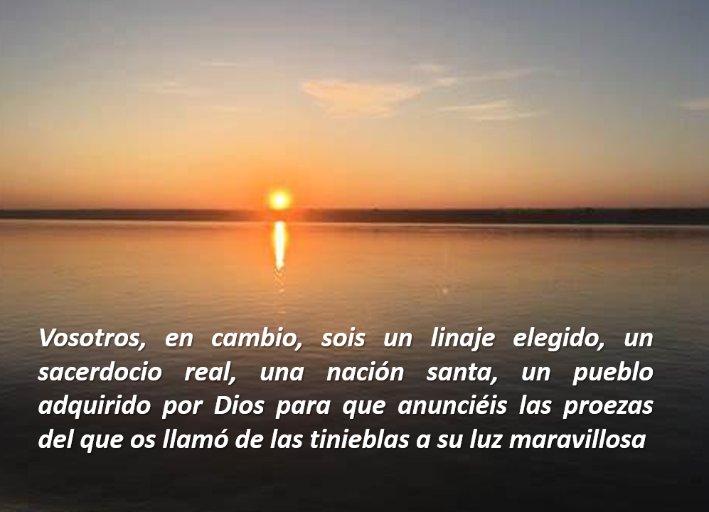 Los especialistas dicen que la primera carta del apóstol Pedro es como una larga catequesis bautismal, lo cual explica lo que dice de la comunidad de bautizados raza elegida, sacerdocio real, nación consagrada, pueblo adquirido, “Vosotros, en cambio, sois un linaje elegido, un sacerdocio real, una nación santa, un pueblo adquirido por Dios para que anunciéis las proezas del que os llamó de las tinieblas a su luz maravillosa” Y también compara simbólicamente al pueblo de Dios con un templo construido con piedras vivas, sobre el cimiento o piedra angular que es Cristo, para construir el Templo del Espíritu.