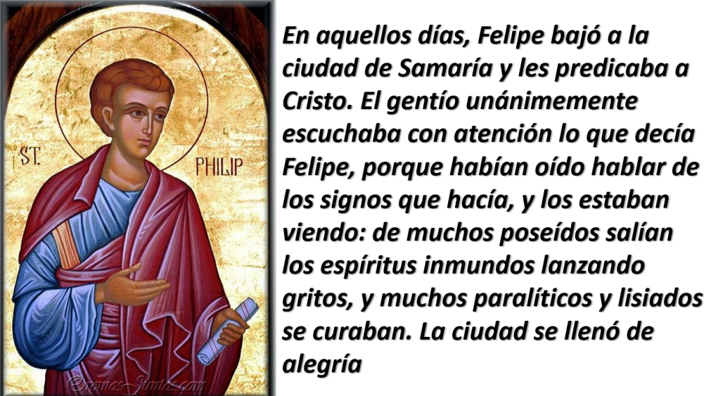 En el libro de los Hechos nos encontramos con la predicación del diácono Felipe en Samaría, la cual tiene un gran éxito, ha anunciado a Jesús y su palabra ha sido acompañada con signos “de muchos poseídos salían los espíritus inmundos lanzando gritos, y muchos paralíticos y lisiados se curaban” Aquellos que lo oían se llenaron de alegría, esto ocurría después del martirio de su compañero diácono Esteba lo que provocó una dispersión de los cristianos de lengua griega, y los que parecía ser el final, fue el comienzo de la expansión de la fe. Ante el auge de la comunidad de Samaría, la comunidad de Jerusalén envía a los apóstoles Pedro y Juan para completar la obra del diácono, a los ya evangelizados por Felipe les imponían las manos y les comunicaba el Espíritu Santo “ellos bajaron hasta allí y oraron por ellos, para que recibieran el Espíritu Santo” Por eso no ha de extrañarnos que el salmo tenga ese tono misionero “aclamada la Señor, tierra entera” “que se postre ante ti la tierra entera” pues, los samaritanos fueron los primeros no judíos en recibir la fe en nuestro Señor Jesucristo.