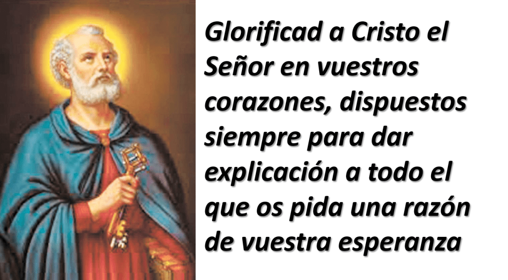 En la segunda lectura, de la primera carta del apóstol Pedro, este nos invita a que sepamos dar testimonio de nuestra esperanza en la vida de cada día “Glorificad a Cristo el Señor en vuestros corazones, dispuestos siempre para dar explicación a todo el que os pida una razón de vuestra esperanza” dándonos como consigna el saber sobrellevar los inconvenientes de la vida con mansedumbre y respeto en medio de la sociedad, aunque nos toque padecer, aun haciendo el bien. Nos pide una actitud contraria a la agresividad y al orgullo, poniéndonos por delante el ejemplo del mismo Jesús, que siendo inocente murió por los culpables para conducirnos a Dios, pero que resucitó a la vida por el Espíritu “Muerto en la carne, pero vivificado en el Espíritu”