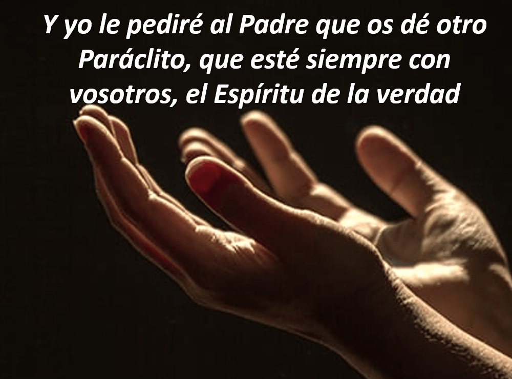 Jesús consciente de que llega la hora de marcharse y cerrar su misión, asegura que los no dejará solos, huérfanos, promete que enviará el Espíritu Santo, al que denomina Paráclito y Espíritu de la verdad “Y yo le pediré al Padre que os dé otro Paráclito, que esté siempre con vosotros, el Espíritu de la verdad”. El será el que los defienda ante las dificultades, su abogado, su fortaleza y su consuelo para la tarea que ha de realizar. Además de que mismo Espíritu Santo es que los llevará a comprender la verdad del evangelio que Jesús ha proclamado con su vida. A este Espíritu no lo conoce el mundo, los atrapados por la mundanidad de vida, se oponen a Él y no lo aceptan, en cambio los discípulos si que lo conocen, pues mora dentro de ellos, estableciendo una relación profunda e íntima, no tienen que buscarlo fura sino dentro. Es la comunión de vida espiritual entre Dios (Trinidad: Padre, Hijo y Espíritu Santo) y los creyentes, y que los tres de un modo o de otro moran en el creyente. Jesús al final desvela que no se marcha para siempre, llegará un momento no muy lejano en el que lo volverán a ver.