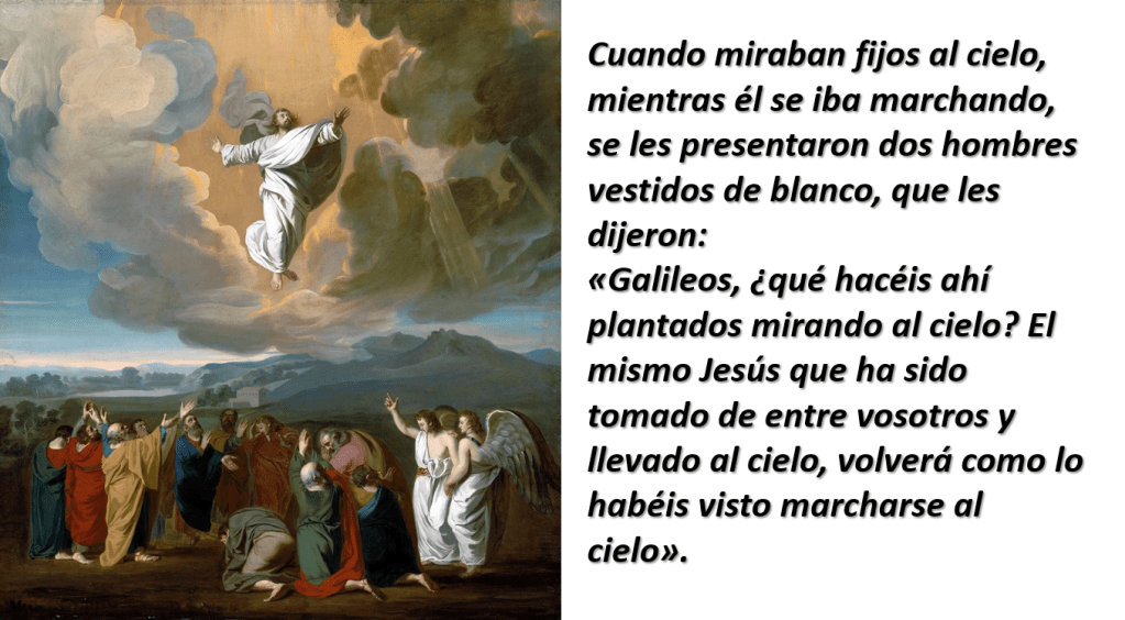 La primera lectura, el relato de la escena de la Ascensión, coincide con el final del evangelio de Lucas, autor también de los Hechos. Es el único autor que nos reata esta escena de la Ascensión y por dos veces, en sus dos escritos. Y por tanto hay una serie de elementos que se repiten en los dos textos: Jesús como protagonista que asciende al cielo y la promesa del Padre que enviará al Espíritu Santo, aunque al final del evangelio no lo dice tan explícitamente como en Hechos. La Ascensión supone el fin de las manifestaciones de Jesús tras la resurrección. Es su última manifestación a los apóstoles, y lo hace subiendo al cielo.