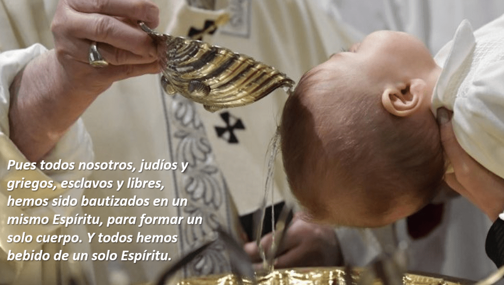 La segunda lectura, trata de la acción del Espíritu en todos los cristianos. Gracias al Espíritu existen en la comunidad cristiana de carismas, de ministerios y de funciones, que no rompen su unidad. Todo lo que somos y tenemos los cristianos es fruto del Espíritu, porque es la forma en que Jesús resucitado sigue entre nosotros, “un mismo Dios que obra todo en todos”. Cuando afirmamos que la Iglesia comenzó a ser viva prolongación de Cristo en la tierra entendemos que es el mismo Espíritu que engendró a Jesús en las entrañas de María, el que dio vida y origen a la Iglesia como comunidad creyente sin distinción entre judios y griegos, ni esclavos y libres, “Pues todos nosotros, judíos y griegos, esclavos y libres, hemos sido bautizados en un mismo Espíritu, para formar un solo cuerpo. Y todos hemos bebido de un solo Espíritu”.