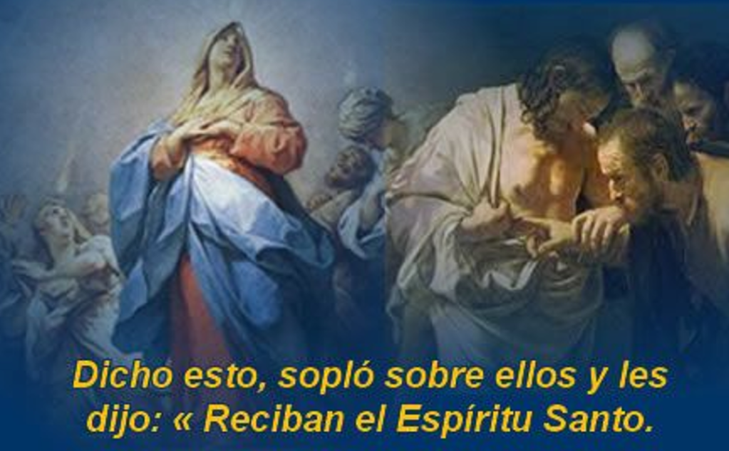 En el evangelio se distinguen cuatro momentos: el saludo, la confirmación de que es Jesús quien se aparece, el envío y el don del Espíritu. El saludo es el habitual de los judíos “¿La paz esté con vosotros!” “Shalom” que no es un simple saludo, pues los apóstoles por el miedo a los judios, estaba muy necesitados de paz. La confirmación, las puertas cerradas, les muestra las manos y el costado, “Y es mostró las manos y el costado” confirma que realmente es él. Todo podía haber terminado aquí, con la paz y la alegría que sustituye al miedo, pero Jesús les encarga una misión, “Como el padre me envió, así os envío yo” Jesús los envía, para lo cual sopla sobre ellos e infunde sobre ellos el Espíritu Santo, “Recibid el Espíritu Santo” don estrechamente vinculado con la misión que les ha encomendado.