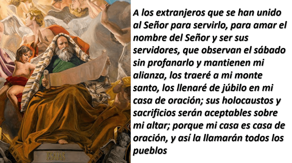 La primera lectura, del profeta Isaías, nos trae un mensaje universalista, la salvación de Dios también está destinada a los extranjeros “los traeré a mi monte santo” El profeta afirma que hay extranjeros que merecen el beneplácito de Dios porque se dan al Señor, le sirven, guardan su alianza y aman su nombre “sus holocaustos y sacrificios serán aceptables sobre mi altar”. Por eso el salmo tiene carácter universal y misionero, el deseo y la oración del salmista es que “conozca la tierra tus caminos, todos los pueblos tu salvación”