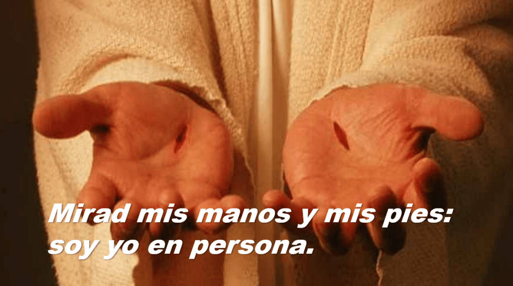 La lectura del evangelio de hoy quiere enlazar con el evangelio del domingo pasado: “Mirad mis manos y mis pies: soy yo en persona. Palpadme y daos cuenta de que un espíritu no tiene carne y huesos, como veis que yo tengo” Las enseñanzas que nos trae Lucas son las experiencias de la presencia de Jesús el crucificado, en la comunidad. El texto se puede dividir en dos partes, en la primera Jesús se aparece y da muestras de que es Él, la segunda es una breve catequesis sobre su pasión, muerte y resurrección.