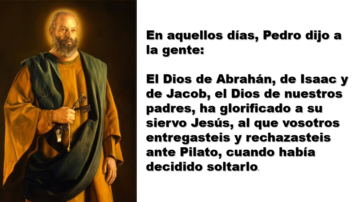 La lectura del libro de los Hechos, el segundo discurso de Pedro después de Pentecostés, proclama con claridad la fuerza del mensaje pascual: la muerte y resurrección de Jesús. La ocasión es la curación extraordinaria de un paralítico, alguien que está impedido. El texto pretende decirnos que la resurrección de Jesús hace posible que todas las imposibilidades ya sean estas físicas, psíquicas o morales, no sean impedimento para seguir el camino nuevo que se estrena tras la resurrección de Jesús. Pedro es el encargado del discurso dejando constancia de que ahora ya no tienen miedo para seguir a Jesús, ni ante las autoridades judías, ni ante las autoridades romanas. Pedro pone de manifiesto que el Dios de los Padres, el Dios de la Alianza, el Dios de Israel, es el que ha glorificado a Jesús, y no otro dios cualquiera. Y si quieren ser fieles a las promesas de Dios, el único camino es Jesús muerto y resucitado.