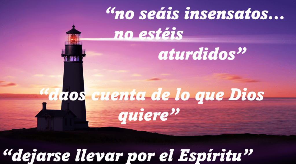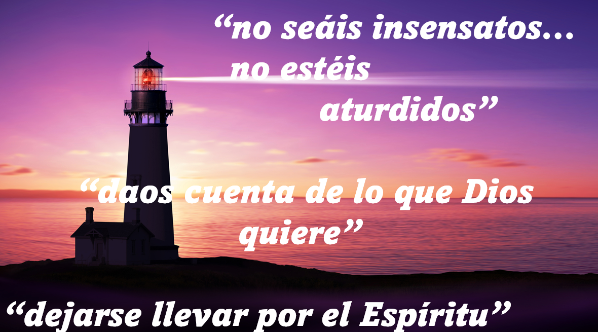 La breve segunda lectura, de la carta del apóstol S. Pablo a los Efesios, presenta un claro panorama de lo que debe ser la vida cristiana, nos llama a la sensatez “no seáis insensatos… no estéis aturdidos” sino “daos cuenta de lo que Dios quiere” y “dejarse llevar por el Espíritu” Todo ello dando alabanzas a Dios, todo un programa de oración, con cantos y salmos inspirados, tocando y cantando “con toda el alma para el Señor” y “dando gracias a Dios por todo, en el nombre de nuestro Señor Jesucristo”