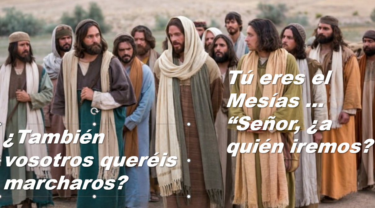 Tras el abandono de muchos solo quedan los Doce. La pregunta de Jesús “¿También vosotros queréis marcharos?” sugiere muchas cosas: desilusión, sensación de fracaso, etc. La respuesta de Pedro, como portavoz del grupo de los Doce, nos recuerda a su confesión de fe en Cesarea de Filipo “Tú eres el Mesías”, aquí Pedro no comienza confesando su fe, sino preguntándole a Jesús “Señor, ¿a quién iremos?” abandonar a Jesús y volver a sus actividades cotidianas, a sus trabajos, es algo que no se les pasa por la cabeza. Necesitan un maestro, alguien que los guie. Pedro lo primero que hace es reconocer que necesitan a Jesús, no pueden vivir sin él. Luego sigue la profesión de fe, pero no dice que Jesús sea el Mesías, sino el “Santo de Dios”