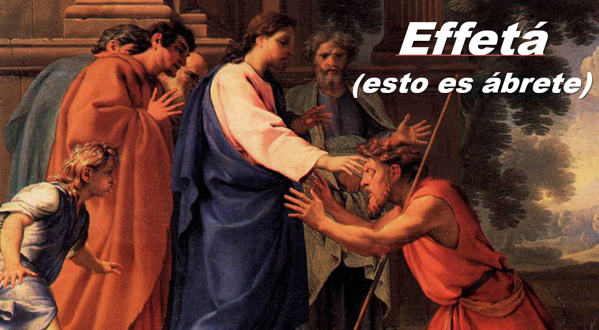 En el evangelio de Marcos nos situamos al final del capitulo siete, Jesús ha curado ya a muchos enfermos: un leproso, un paralítico, uno con la mano atrofiada, una mujer con flujo de sangre, ha resucitado a la hija de Jairo, y ha curado otras muchas dolencias tanto físicas como psíquicas. Ninguno de estos milagros le ha supuesto el menor esfuerzo, bastó su palabra o el simple contacto con su persona o manto para que se produjese la curación. Pero la lectura en de hoy, la curación del sordo le va ha suponer un notable esfuerzo, el sordo que además habla con dificultad no viene por iniciativa propia como en las anteriores curaciones, sino que se lo traen algunos amigos o familiares. Jesús tiene que realizar un ritual, lo toma de la mano, lo aparta y se queda a solas con él, le mete los dedos en los oídos, escupe en sus dedos, toca con saliva la lengua del enfermo, levanta la vista al cielo, suspira y pronuncia “Effetá (esto es ábrete)” Con respecto a las anteriores curaciones nos preguntamos el porque en este caso el motivo ritual, la respuestas quizás la tengamos en el relato anterior a este donde Jesús reprocha a sus discípulos “Tenéis ojos ¿y no veis? Tenéis oídos ¿y no oís?” Ojos que no ven y oídos que no oyen. Ceguera y sordera de los discípulos, sugiere lo difícil que fue para Jesús que Pedro y los demás discípulos terminaran viendo y oyendo, estos abrirán los ojos y los oídos con la resurrección, y a nosotros no pasa algo parecido, abriremos nuestros ojos y oídos cunado exclamemos como Tomás “¡Dios mío y Señor mío!”