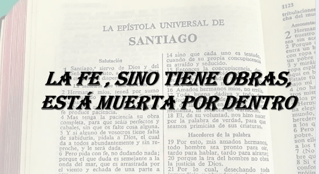 La carta de Santiago denuncia la postura del que dice y presume de tener fe, pero no hace nada bueno. Nos salva Jesús y su fe en él, pero lo que está claro que esa fe nos lleva a una vida guiada por los frutos del Espíritu de Dios. El texto refleja una polémica entre dos posturas, por un lado, los partidarios de observar estrictamente la Ley de Moisés, como si fuera ella la que nos salva; y por otro, la postura de los que defienden que la salvación viene por la fe en Cristo. Santiago, para esclarecer la polémica, pone como ejemplo la respuesta de uno que presume tener fe ante un hermano que pasa hambre “Si un hermano o una hermana andan desnudos y faltos del alimento diario y uno de vosotros les dice: ‘Id en paz; abrigaos y saciaos’, pero no les da lo necesario para el cuerpo; ¿de qué sirve?”. Es un ejemplo esclarecedor que nos da que pensar: ¿no actuamos nosotros de la misma manera, que creemos que por cumplir una serie de preceptos ya estamos salvados, sin importarnos nuestros hermanos?