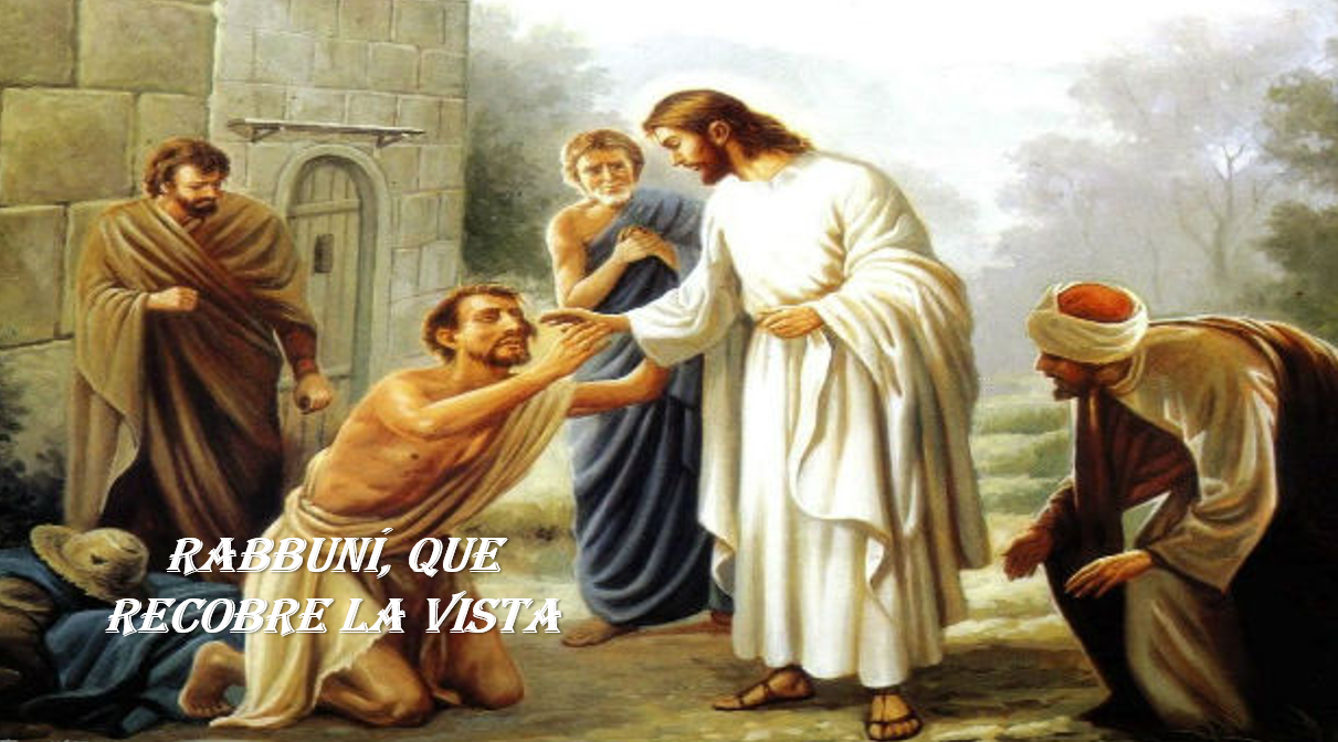 Bartimeo ha elegido un buen lugar para pedir limosnas, precisamente el camino más transitado. Cuando se entera que pasa “Jesús Nazareno” grita pidiéndole compasión. Los acompañantes y discípulos de Jesús le mandan callar. Bartimeo no se deja influenciar por lo que dicen, insiste y grita aún más fuerte “Hijo de David, ten compasión de mi”, consigue llamar la atención de Jesús que manda llamarlo. Los que le mandaban callar ahora le dicen “Ánimo, levántate que te llama”. No le llama para seguirle, sino para curarle, pero la auténtica curación será seguirle camino de Jerusalén, es una actitud diferente de los discípulos que discutieron por el camino quién es el mayor.