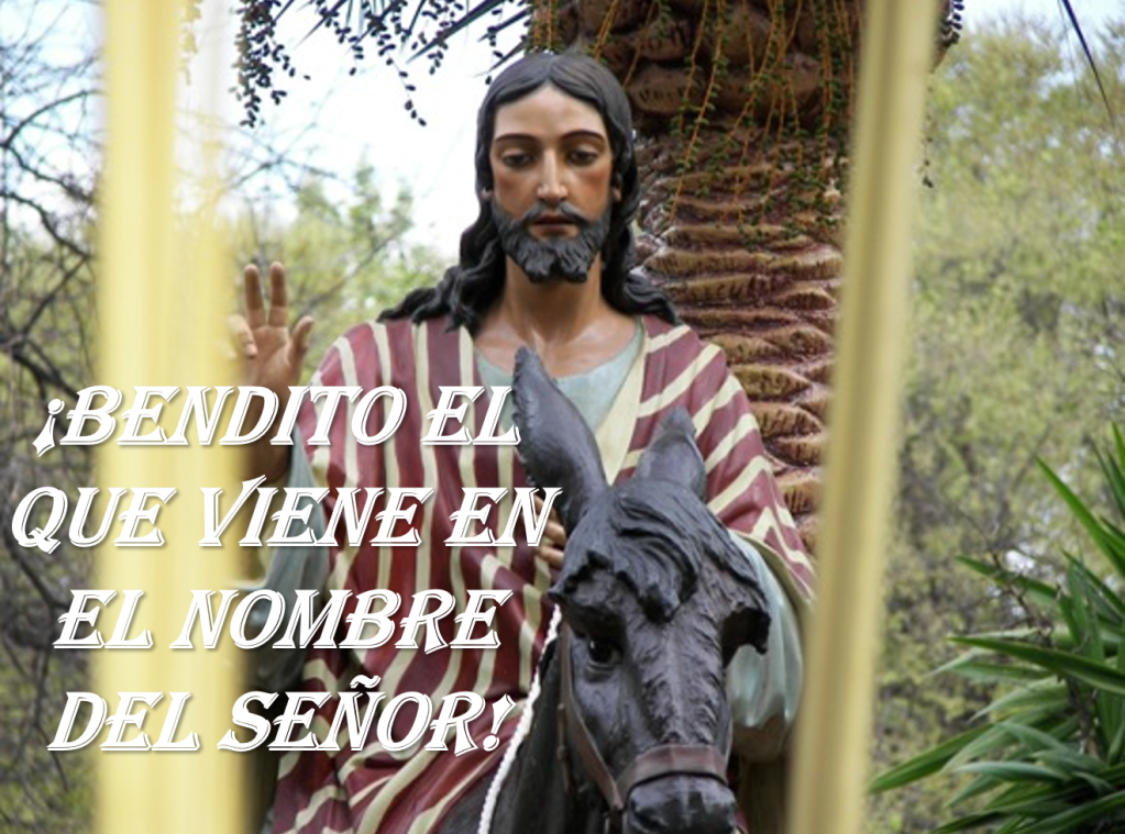 Fuera del templo, Jesús que viene en nombre del Señor, lo aclamamos con ramos y cantos porque es nuestra Paz. Viene montado en un pollino, signo de la sencillez, la entrega y la paz ante todo “Paz en el cielo y gloria en las alturas”, la reconciliación entre las personas y los pueblos.
