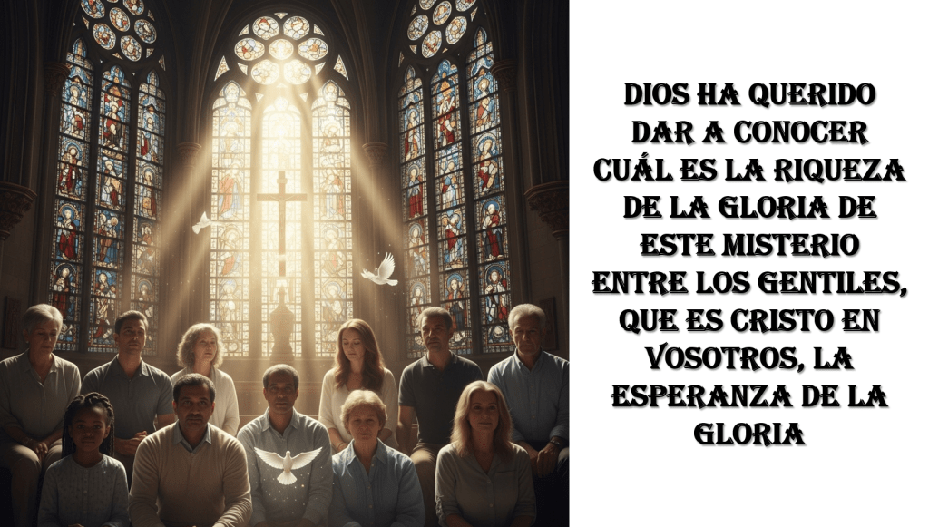 La segunda lectura, de la carta a los Colosenses, aparece superadas las dificultades de los primeros momentos en cuanto a compartir la fe y vivirla los que son de procedencia judía con los que no lo son, es decir los gentiles, los procedentes de la gentilidad. Pablo dice que sufre por el Evangelio, por las comunidades fundadas por él, a quienes sirve con entrega. Pablo resalta la idea de la revelación “llevar a plenitud la palabra de Dios, el misterio escondido desde siglos y generaciones y revelado ahora a sus santos, a quienes Dios ha querido dar a conocer cuál es la riqueza de la gloria de este misterio entre los gentiles, que es Cristo en vosotros, la esperanza de la gloria” La voluntad de Dios era un misterio que finalmente se ha dado a conocer. Pablo distingue entre el periodo del antiguo Israel, tiempo del misterio escondido, frente al tiempo del nuevo Israel, el misterio revelado. Y son los santos, esto es la comunidad cristiana, quienes han llegado al conocimiento.