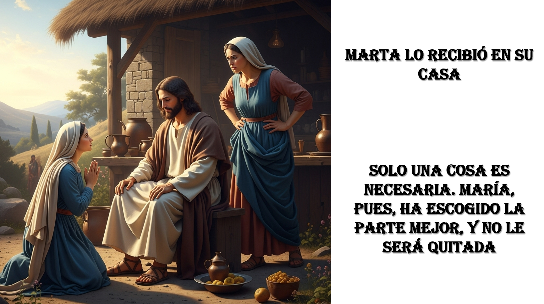 En el evangelio, Jesús sigue de camino a Jerusalén, hace un alto en el camino y entra en una casa de una aldea que, por el evangelio de Juan, sabemos que es Betania, donde vivían una familia de conocidos y amigos de Jesús, estos son Lázaro y sus hermanas Marta y María. Marta recibió a Jesús y se afanó en los muchos servicios. María, por el contrario, se sienta a los pies de Jesús en actitud de discípula, algo poco común e inusual en la época en que solo los hombres eran discípulos. A Marta le viene muy grande, le desborda, su afán por atender a Jesús y necesita que su hermana le ayude. Por ello pide a Jesús que le diga que le eche una mano y que deje de escuchar, pero Jesús le replica “solo una cosa es necesaria. María, pues, ha escogido la parte mejor, y no le será quitada”