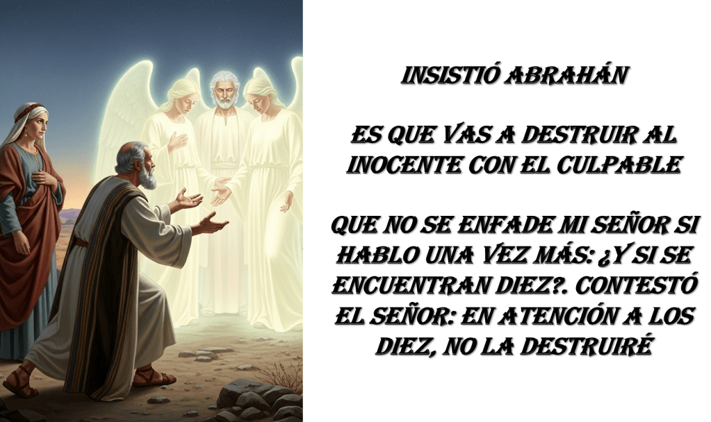 La primera lectura, tomada del libro del Génesis, es continuación del leído la semana pasada, el episodio de Mambré en el que Abrahán y Sara fueron visitados por tres personajes divinos. Tras la visita se dirigen a Sodoma y Abrahán, que continua con la hospitalidad, los acompaña para despedirse de ellos. La lectura de este domingo nos habla de la intercesión de Abrahán “Insistió Abrahán” en favor de una ciudad pecadora llamada Sodoma. Pone a Abrahán como ejemplo de persona que tiene una profunda confianza en Dios, es un hombre justo y fiel “es que vas a destruir al inocente con el culpable”, que exige fidelidad a los designios de Dios, y se atreve a insistir en la oración, a pedir cada vez más, porque sabe que el Señor es bueno Abrahán continuó: “Que no se enfade mi Señor si hablo una vez más: ¿Y si se encuentran diez?. Contestó el Señor: En atención a los diez, no la destruiré”. El relato destaca la desproporción: a pocos inocentes que haya, Dios inclina la balanza, perdonando a un número de culpables mucho mayor.