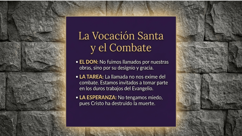 San Pablo, en la segunda lectura, profundiza en esta vocación santa recordándonos que no se nos ha llamado por nuestras obras, sino por el designio y la gracia de Dios “Él nos salvó y nos llamó a una vocación santa, no por nuestras obras, sino según su designio y según la gracia que nos dio en Cristo”. Sin embargo, esta llamada no nos exime del combate; al contrario, el apóstol exhorta a Timoteo y a cada uno de nosotros a tomar parte en los duros trabajos del Evangelio. Es una invitación a no tener miedo de la cruz, pues en la aparición de nuestro Salvador, Cristo Jesús, la muerte ha sido destruida y ha hecho brillar la vida imperecedera.