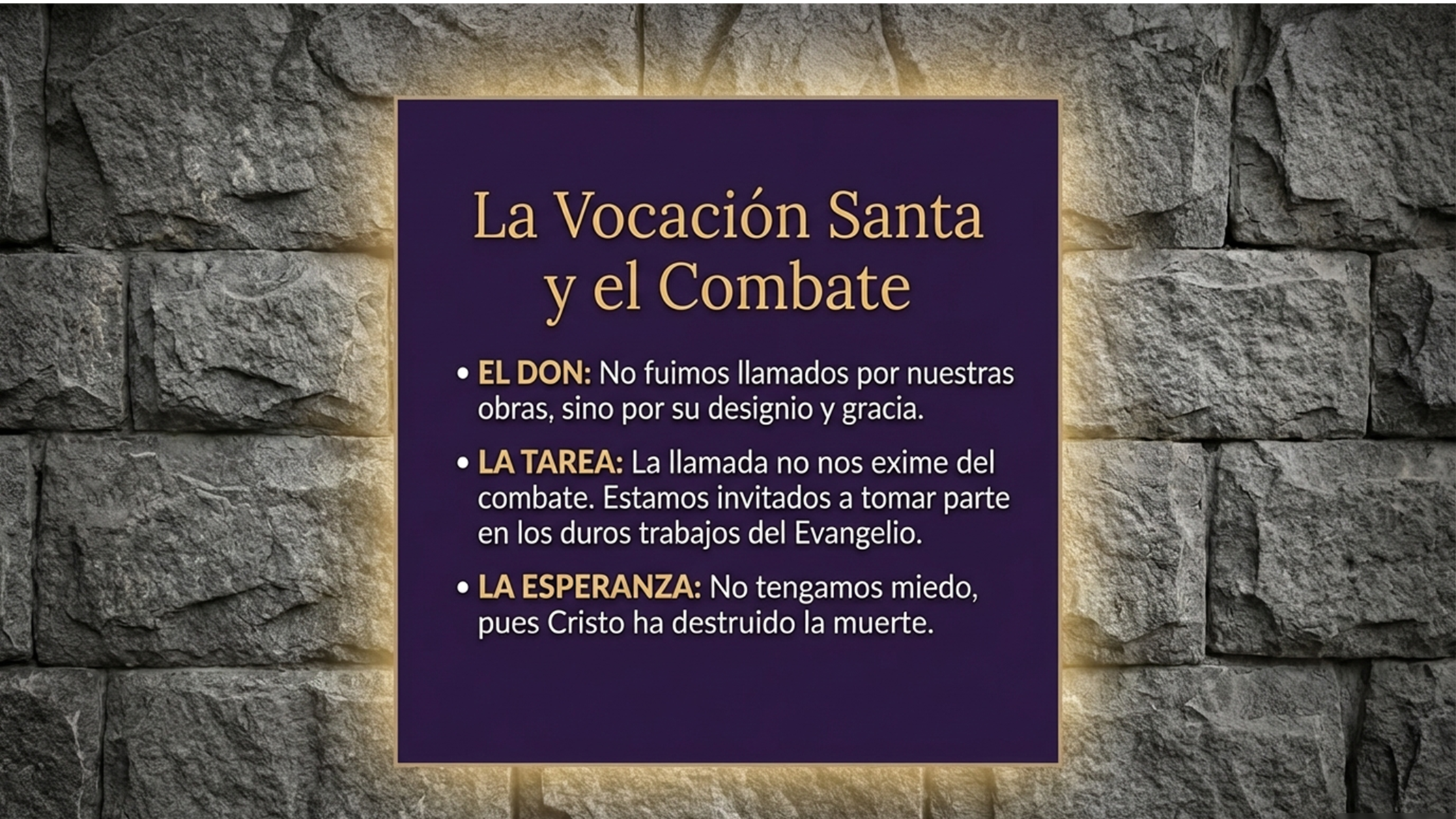 San Pablo, en la segunda lectura, profundiza en esta vocación santa recordándonos que no se nos ha llamado por nuestras obras, sino por el designio y la gracia de Dios “Él nos salvó y nos llamó a una vocación santa, no por nuestras obras, sino según su designio y según la gracia que nos dio en Cristo”. Sin embargo, esta llamada no nos exime del combate; al contrario, el apóstol exhorta a Timoteo y a cada uno de nosotros a tomar parte en los duros trabajos del Evangelio. Es una invitación a no tener miedo de la cruz, pues en la aparición de nuestro Salvador, Cristo Jesús, la muerte ha sido destruida y ha hecho brillar la vida imperecedera.
