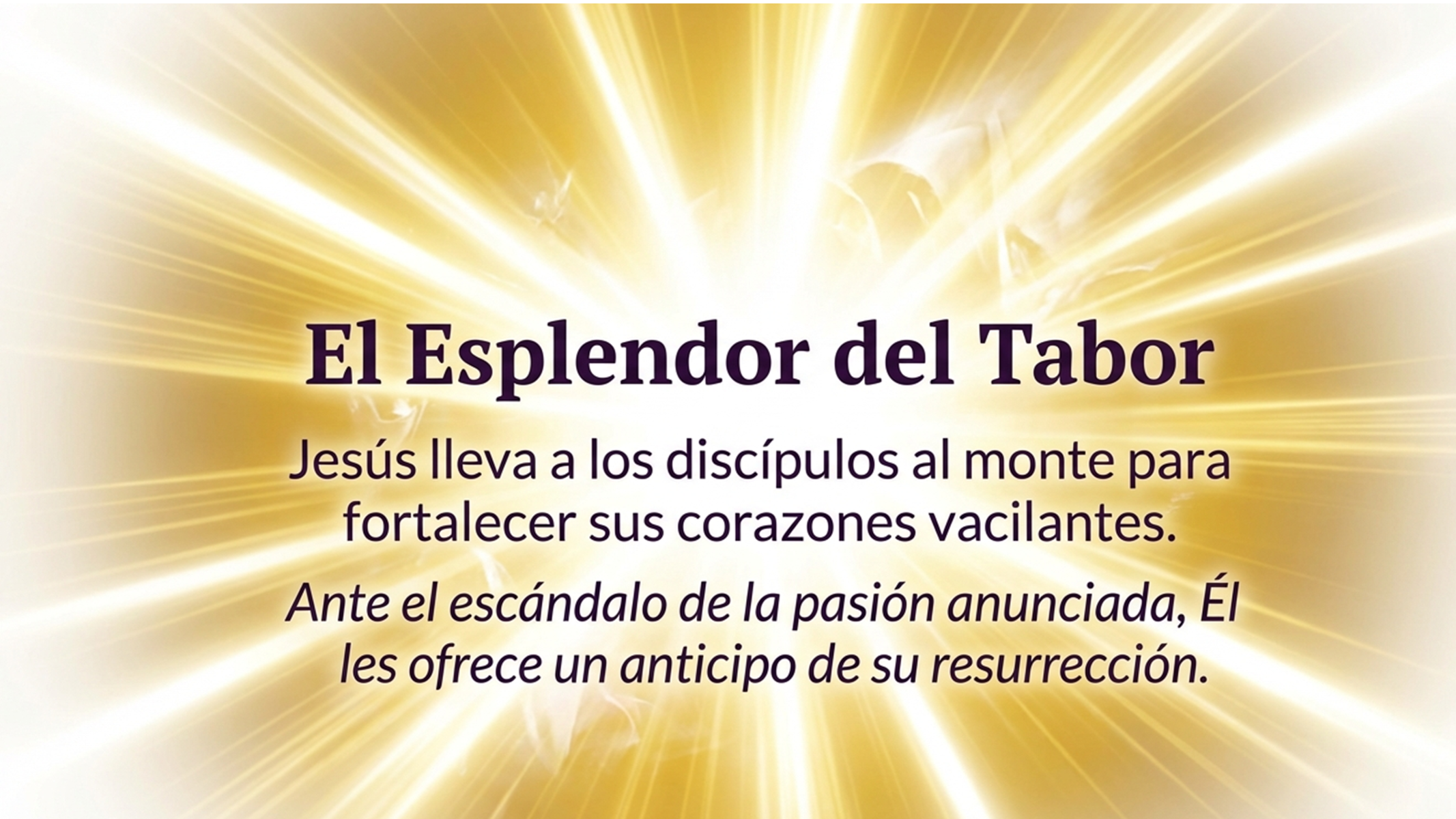Este misterio de luz y sufrimiento alcanza su punto culminante en el Evangelio de la Transfiguración. Jesús, tras anunciar por primera vez su pasión y muerte a unos discípulos escandalizados, los lleva al monte para fortalecer sus corazones vacilantes con un anticipo de su resurrección. En el esplendor del Tabor, el rostro de Jesús resplandece como el sol, revelando que Él es la meta de toda la historia, custodiado por Moisés y Elías, representantes de la Ley y los Profetas.