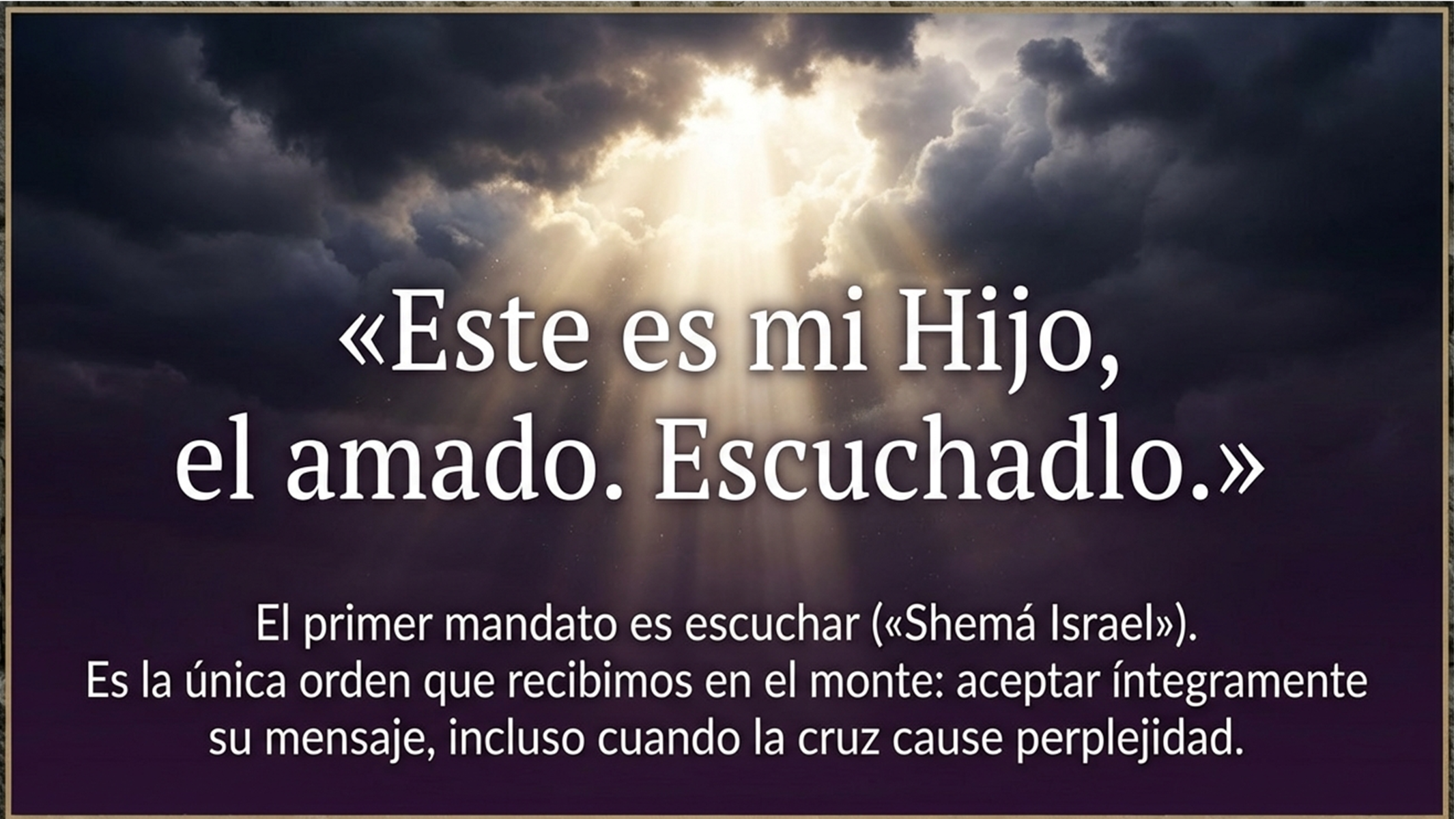 El momento central de esta teofanía es la voz del Padre que resuena desde la nube luminosa: “Este es mi Hijo, el amado, mi predilecto. Escuchadlo”. Esto nos recuerda, cuando aquellos fariseos preguntan a Jesús para ponerlo aprueba, acerca del primer y único mandamiento de la Ley, Jesús responde con dos, el primero la “Shemá Israel o Escucha Israel”, el segundo el amor al prójimo, el primer mandato es escuchar. Este es el único mandato que recibimos en el monte: escuchar con docilidad la Palabra de Jesús, estar atentos a la llamada, aceptando íntegramente su mensaje, incluso cuando la cruz nos cause perplejidad. La Transfiguración nos enseña que el camino de la cruz no es un destino de muerte, sino el paso necesario hacia la gloria plena.