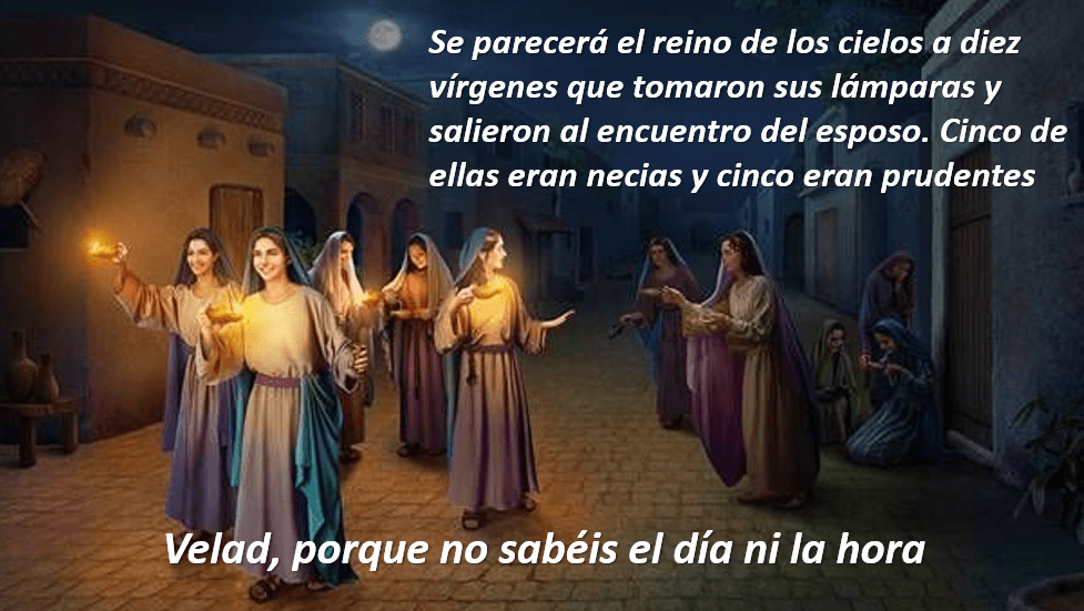 Mateo en el Evangelio pone en boca de Jesús la parábola de las diez jóvenes, vírgenes o doncellas, cinco sabias y cinco necias “Se parecerá el reino de los cielos a diez vírgenes que tomaron sus lámparas y salieron al encuentro del esposo. Cinco de ellas eran necias y cinco eran prudentes”.Con ella nos quiere enseñar un doble propósito, primero mantener viva la certeza del retorno del Señor y segundo de cómo debemos estar debemos de vivir durante este tiempo de vigilia hasta la llegada del Señor. Los peligros que existen durante este periodo deben ser superados por los cristianos. Vivir con vigilante impaciencia y despreocupados de los afanes de este mundo, sería una evasión, vivir preocupados de los afanes del mundo, hasta despreocuparse de estar vigilante, sería una mundanización. Olvidarse Señor o no tener paciencia para esperar su vuelta es un riesgo, igual que relajarse y descuidar la actitud vigilante. No cuenta si la vuelta de Jesús es inminente o o se demora, sino el estar preparados. Cuando llegue el esposo sólo aquellos que tienen las lámparas con suficiente aceite entrarán con él en el banquete, en la boda, mientras los no preparados encontrarán la puerta cerrada y excluidos del Reino “Las que estaban preparadas entraron con él al banquete de bodas, y se cerró la puerta”