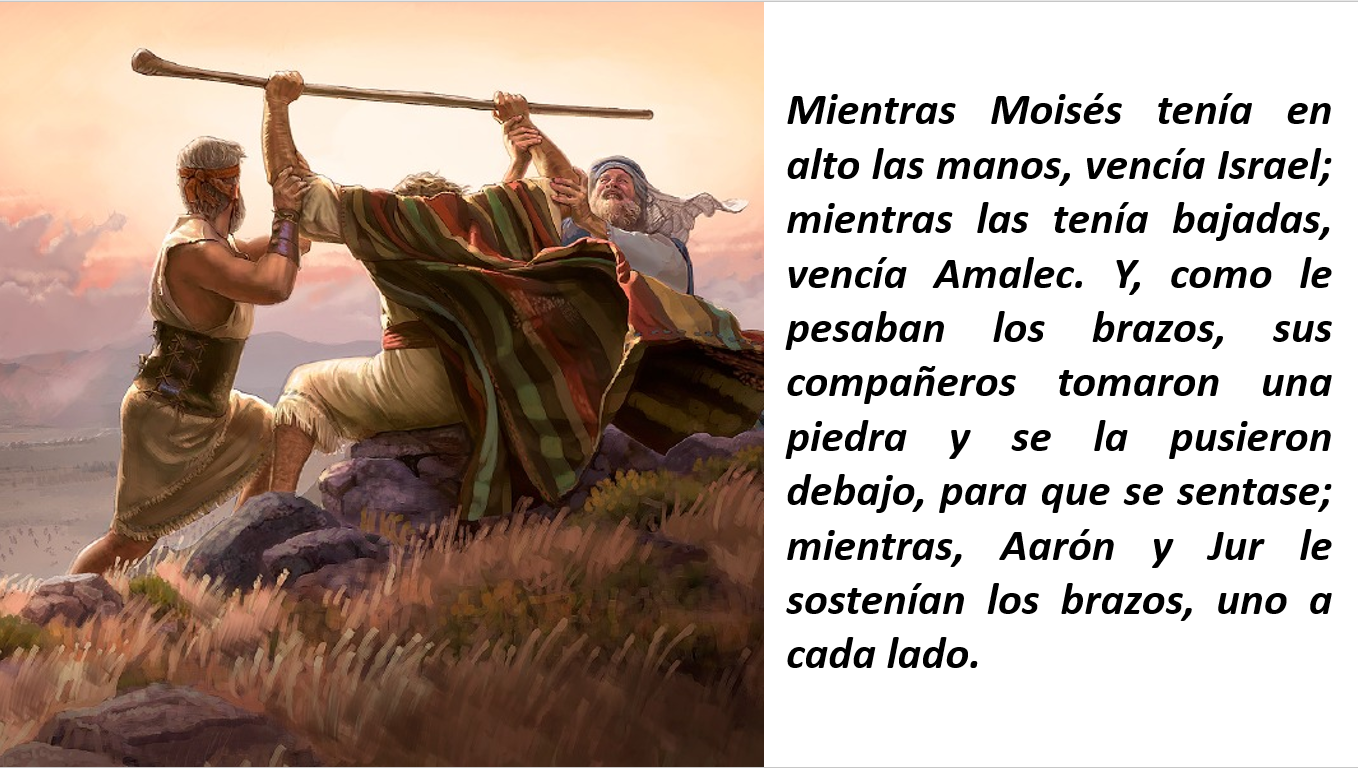 En la lectura, del libro del Éxodo, manifiesta la eficacia de la oración de una manera muy concreta, muestra la eficacia de la oración de Moisés por su pueblo. Israel se tiene que defender de los ataques de Amalec, de los amalecitas, y su victoria depende por completo de la oración de Moisés, el texto nos dice que mientras tenía el alto la mano vencía Israel, en caso contrario lo hacía Amalec. Así se manifiesta la eficacia de la oración, la necesidad de una oración perseverante e insistente. Los israelitas encuentran el medio para hacer posible una oración perseverante por parte de Moisés, el cual se puso en alto en una colina para rezar a Dios, le sentaron e hicieron que Jur y Aarón les sostuvieran los brazos en alto, para mantener a Moisés en actitud de súplica “Así resistieron en alto sus brazos hasta la puesta del sol. Josué derrotó a Amalec y a su tropa” El salmo responsorial refleja muy bien esta situación, así cantamos en la primera estrofa “Levanto mis ojos a los montes: ¿de dónde me vendrá el auxilio? El auxilio me viene del Señor, que hizo el cielo y la tierra”.