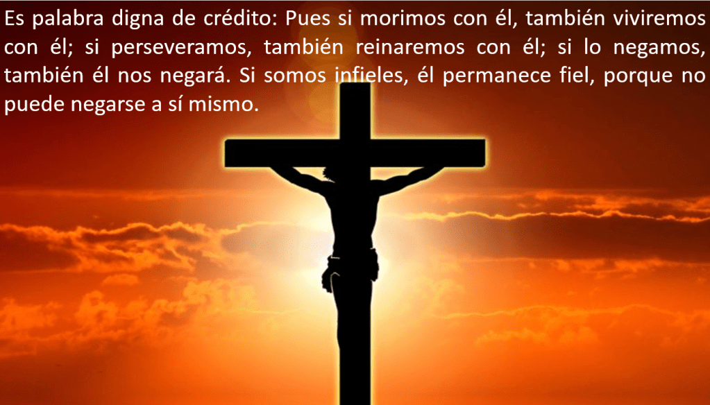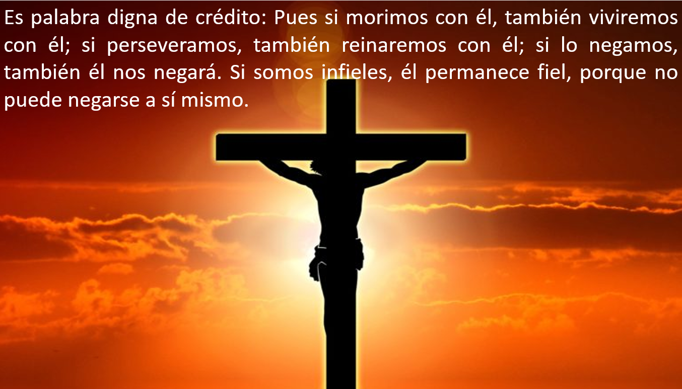 La segunda lectura continúa con la segunda carta de Pablo a Timoteo, en esta ocasión nos viene a decir que hay que dar gracias por todo, incluso en las situaciones y circunstancias dolorosas, porque también en ellas viene la gracia de Dios e incluso mayor gracia que en circunstancias y situaciones gozosas. Con la fe sabemos que el Señor sale a nuestro encuentro en las ocasiones dolorosas y nos conforta. Pablo afirma que, para vivir con Cristo, es necesario morir con él “si morimos con él, también viviremos con él”, para alcanzar la salvación es preciso pasar por dificultades y sufrimientos, es la vida misma, Pablo nos dice: “si perseveramos, también reinaremos con él” Por eso cuando encontremos alguna dificultad, esta no debe ser motivo de tristeza completa, sino ocasión para abrir los ojos y reconocer que Dios no nos abandona, sino que nos manifiesta su amor y generosidad “Acuérdate de Jesucristo, resucitado de entre los muertos … Por eso lo aguanto todo por los elegidos, para que ellos también alcancen la salvación y la gloria eterna en Cristo Jesús”