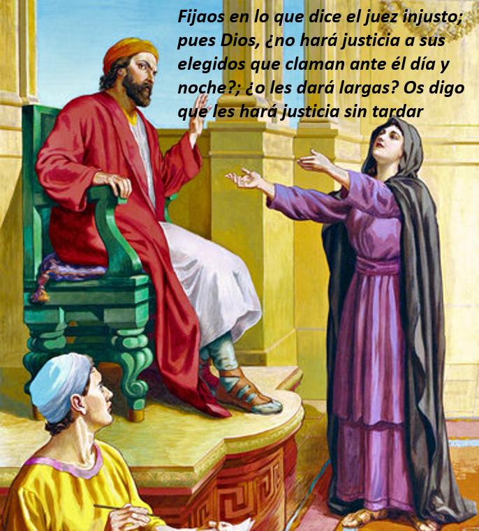 En este caso Jesús se sirve una parábola, de una viuda que insistentemente ruega aun juez injusto, corrupto y sin temor de Dios, a que le haga justicia. El juez por no escucharla le hace justicia “Aunque ni temo a Dios ni me importan los hombres, como esta viuda me está molestando, le voy a hacer justicia, no sea que siga viniendo a cada momento a importunarme”. Y si este juez que era nada ejemplar actúa así, pues imaginemos como actuará Dios en nuestra insistencia en la oración “Fijaos en lo que dice el juez injusto; pues Dios, ¿no hará justicia a sus elegidos que claman ante él día y noche?; ¿o les dará largas? Os digo que les hará justicia sin tardar”. Pues, así como la viuda, oramos insistentemente y presentamos nuestras vidas a Dios, le pedimos que nos ayude con confianza, insistencia y perseverancia en la en la oración, pues la oración perseverante refuerza nuestra relación personal con Él. La base de nuestra relación personal con Él es orar con insistencia y con actitud de fe.