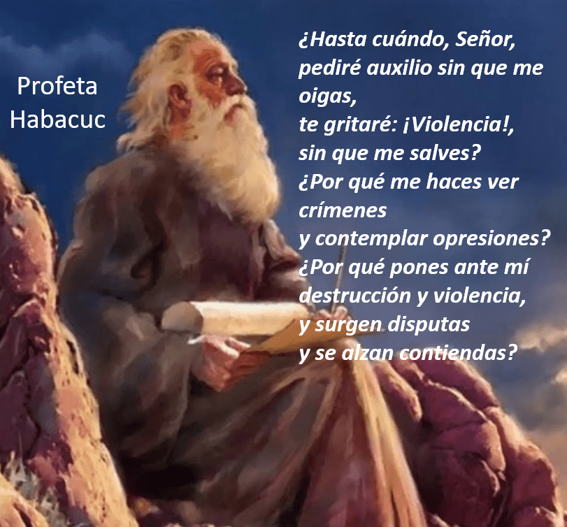 En primera lectura, el profeta Habacuc protesta ante Dios “Hasta cuando, Señor, pediré auxilio sin que me oigas …” El profeta está cansado de tantas violencias, desgracias, catástrofes, guerras. ¿Cómo puede ser que Dios lo consienta? Una pregunta que sigue oyéndose hoy con frecuencia, la situación es parecida, en nuestra sociedad parece que reina el desconcierto, violencia, desgracias, catástrofes, pandemia, terremotos, volcanes que arrojan lava y destruyen todo a su paso, fuego, sequía, inundaciones, amenaza de hambruna, guerras olvidadas y no tan olvidadas como la de Ucrania. Por aquellos entonces el pueblo judío, que ha escapado del imperio de los asirios, ahora vive el comienzo del imperio babilónico que será el terror de los israelitas, vamos lo que solemos decir en nuestros días: salieron de guatemala y se metieron en guatepeor “¿Por qué me haces ver crímenes y contemplar opresiones? ¿Por qué pones ante mí destrucción y violencia, y surgen disputas y se alzan contiendas?” Pero la respuesta de Dios invita a tener paciencia, a respetar los tiempos y ritmos de la historia, y a tener confianza “Escribe la visión y grábala en tablillas, que se lea de corrido … pues llegará y no tardará” El justo se fía de dios y le es fiel en su vida, “el justo por su fe vivirá” aunque no entienda muchas cosas, ni los planes de salvación de Dios. Al profeta no se le da la respuesta completa, pero se le pide confianza y fe.