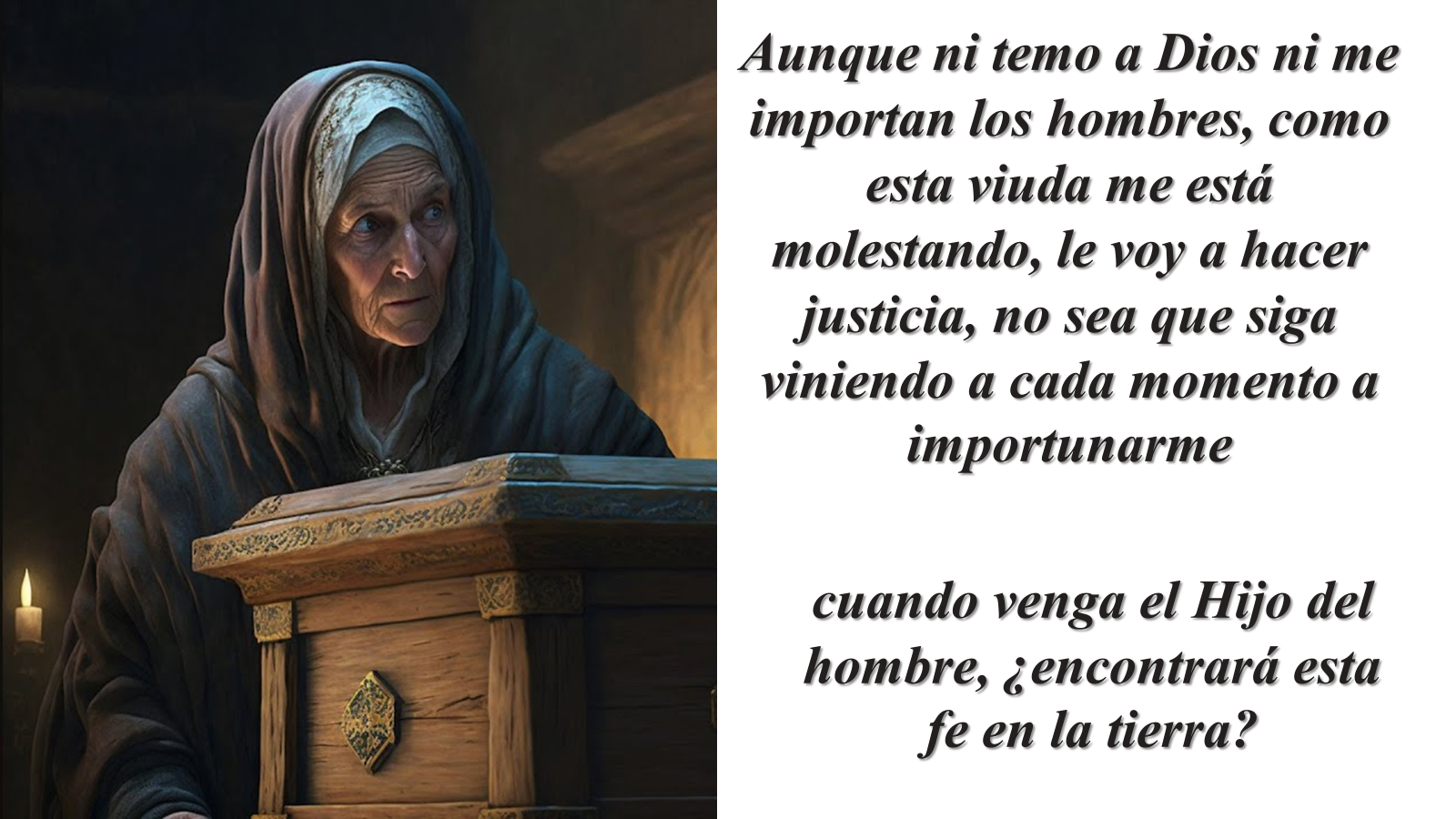 En este caso Jesús se sirve una parábola, de una viuda que insistentemente ruega aun juez injusto, corrupto y sin temor de Dios, a que le haga justicia. El juez por no escucharla le hace justicia “Aunque ni temo a Dios ni me importan los hombres, como esta viuda me está molestando, le voy a hacer justicia, no sea que siga viniendo a cada momento a importunarme”. Y si este juez que era nada ejemplar actúa así, pues imaginemos como actuará Dios en nuestra insistencia en la oración “Fijaos en lo que dice el juez injusto; pues Dios, ¿no hará justicia a sus elegidos que claman ante él día y noche?; ¿o les dará largas? Os digo que les hará justicia sin tardar”. Pues, así como la viuda, oramos insistentemente y presentamos nuestras vidas a Dios, le pedimos que nos ayude con confianza, insistencia y perseverancia en la en la oración, pues la oración perseverante refuerza nuestra relación personal con Él. La base de nuestra relación personal con Él es orar con insistencia y con actitud de fe.